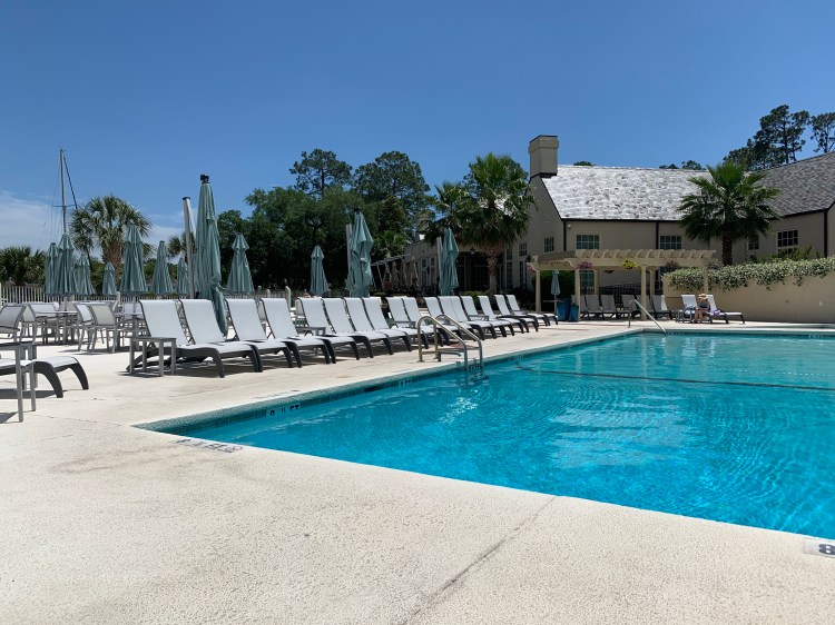 Once we arrived we had to wait while Breakaway entered the lock first. Once they were in and tied off in their slip we went. It was tight! We made it just fine and it didn’t take long. It was an ascending lock of only 6 inches. We found our spot quickly and we were greeted by the Yacht Clubs Commodore! What a great welcome! Then we got ready for the pool! The pool was nice! New chairs and every couple chairs had a big umbrella!