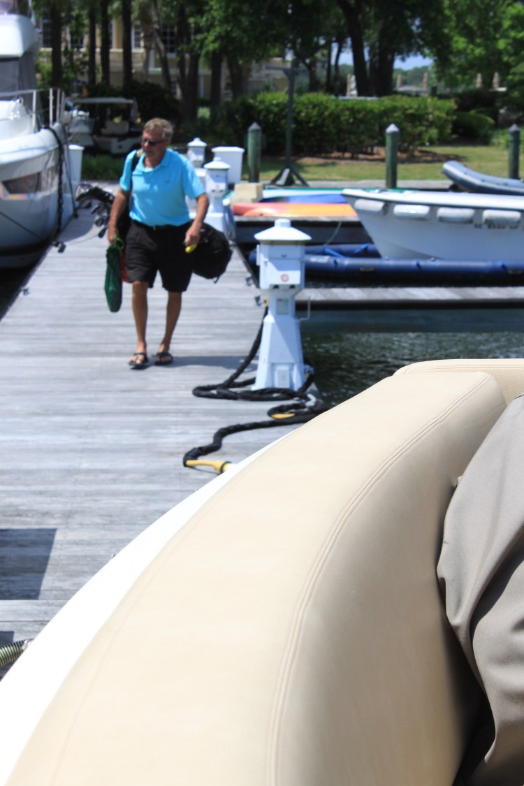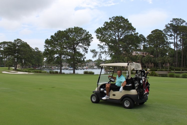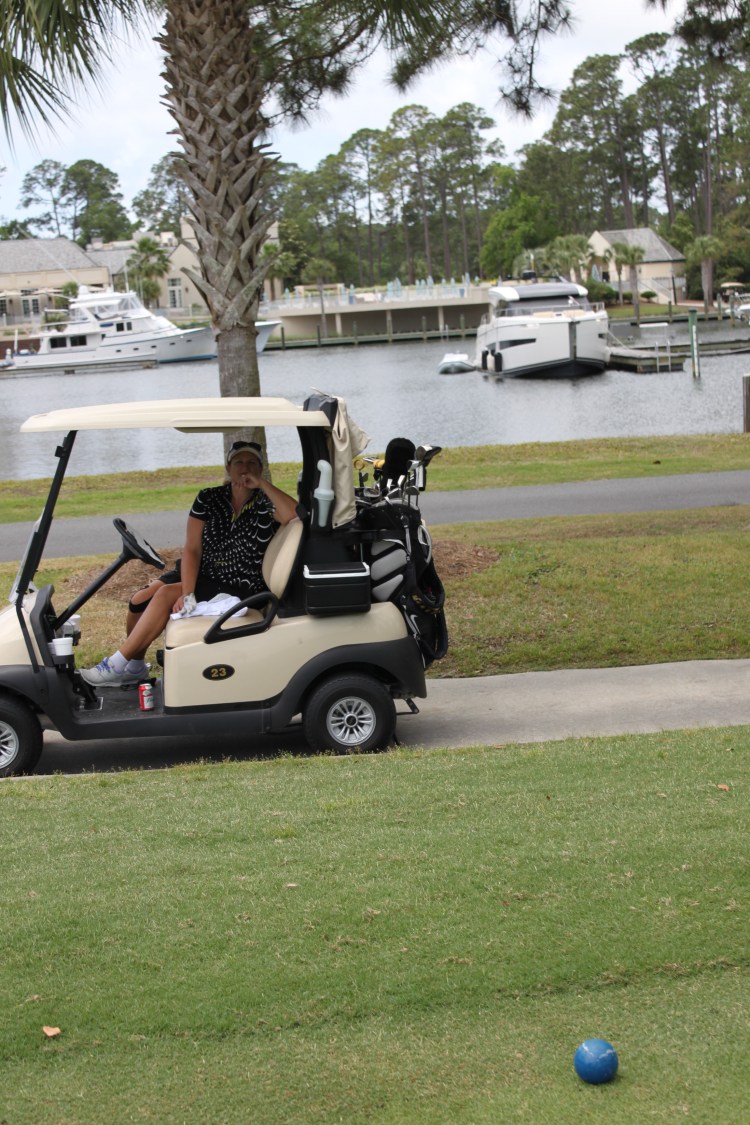 Michelle and Jeff took their bikes all over the island while we golfed. On our way to the clubhouse we stopped at the docks to drop off the clubs.