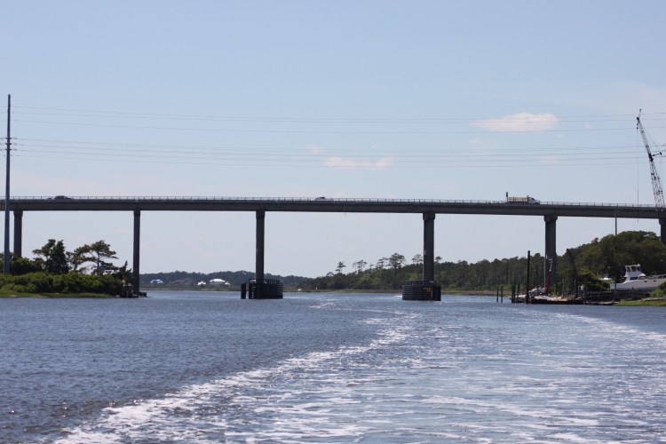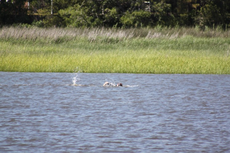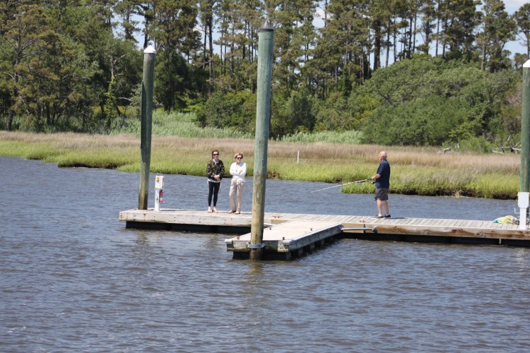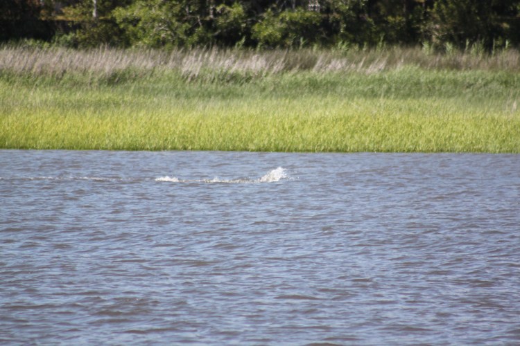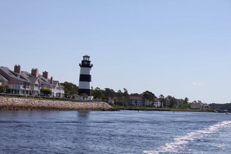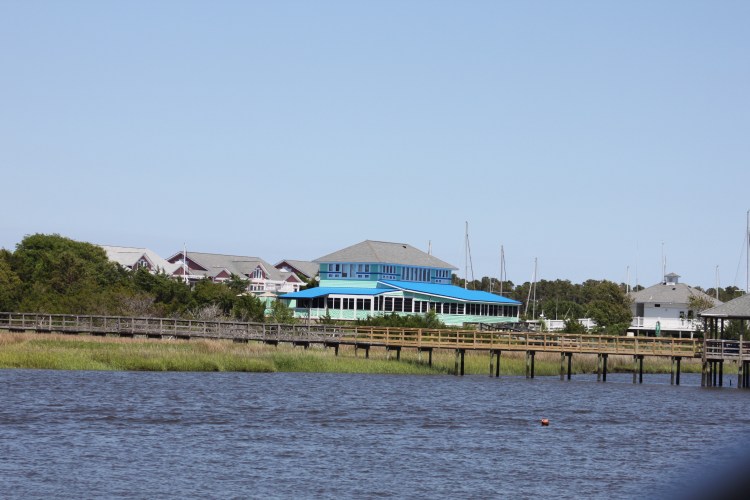 When we got to our marina we had to wait outside as there was only one dockhand. While waiting outside the harbor we saw tons of dolphins. There were about 5 or 6 different groups and they were really playing in the water. They were right near the path that the Bald Head Island Ferry takes and yet they seemed to love that spot! The ferry is on our harbor so we also had to wait for it.