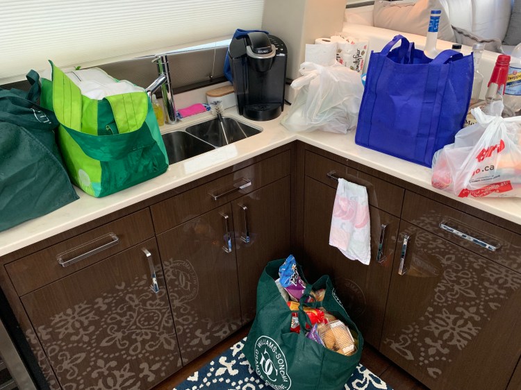 Then we got to the grocery store before the rain…. then when we had to walk back to the boat with 2 carts of groceries the rain started. Lol.