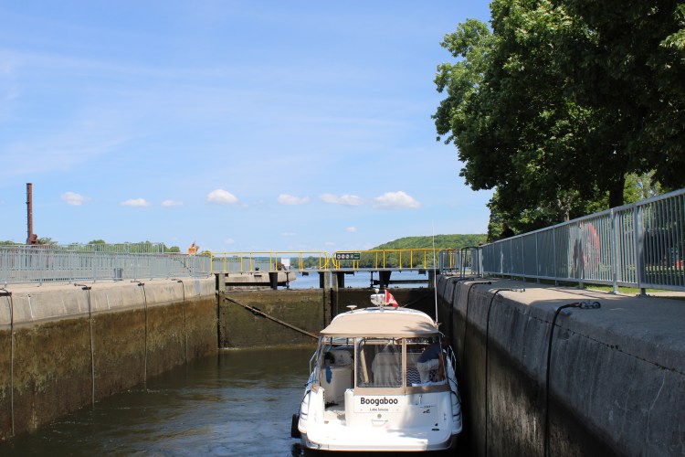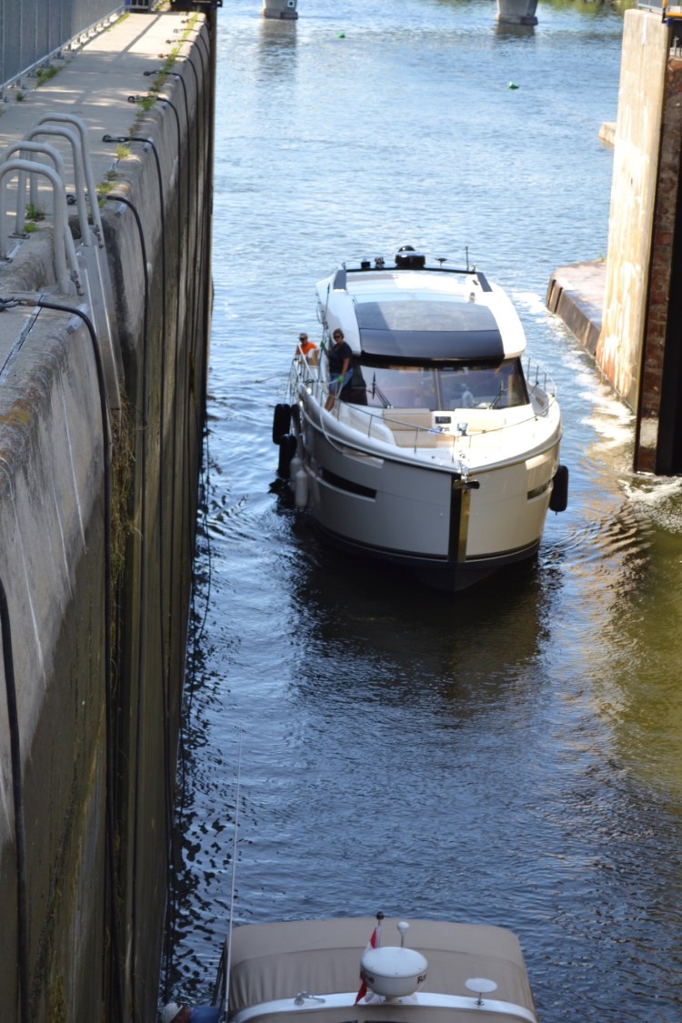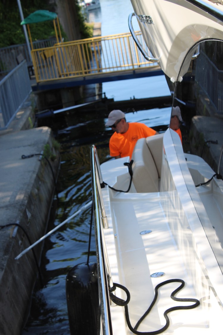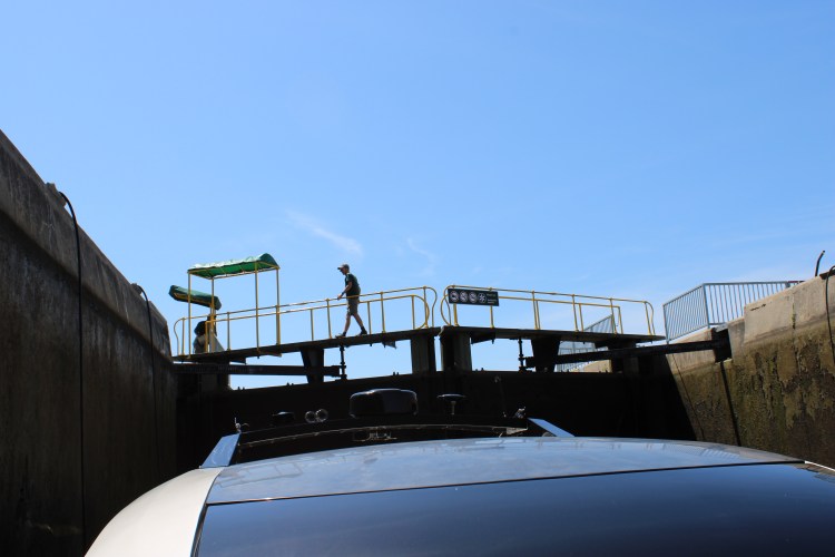Now it was time to find a spot on the wall just outside of the Frankford Lock. There were already 3 boats on the Starboard side so the boat that was in front of us all day took the empty port side. We followed.