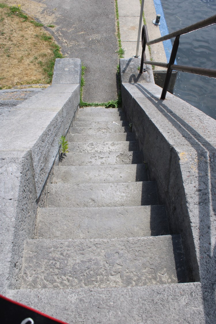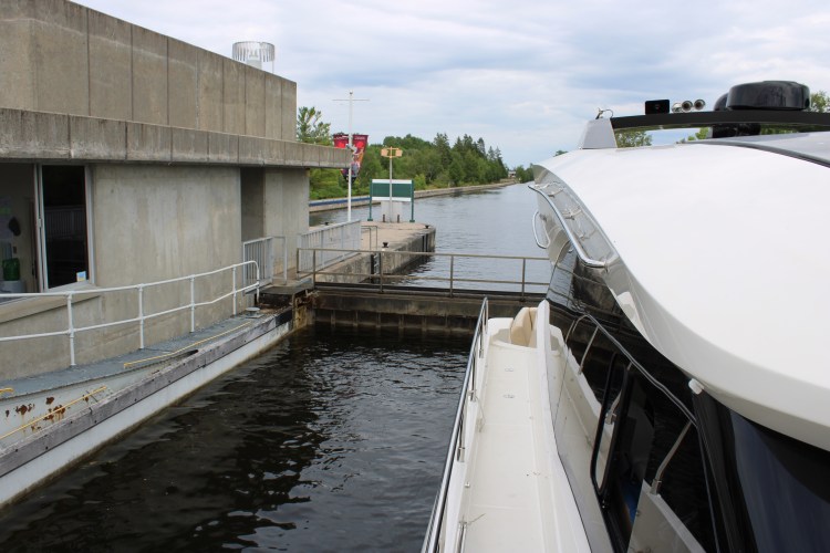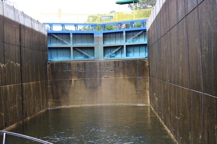 It was about 15 miles between lock 32 and lock 34. Lock 33 is gone – at Fenelon Falls there used to be 2 locks but this lock 34 is new and replaced both 33 and the old 34 locks. We had to tie off on the wall and wait as there were boats locking through when we arrived.