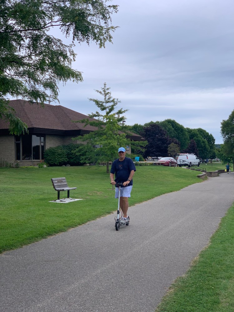 Frank and Deb swung by the boat to get their car we had borrowed last night. And soon Nick got his scooter to show Frank. We had Frank and Deb try out the scooters- – more than likely they will be an addition to the Kerrigan Class A motor home!
