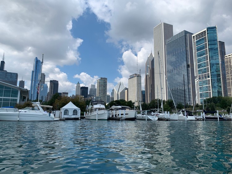 Look close at this photo and you will see a green kayak. With the Sears tower and the CNA building (aka Big Red) – great photo of the South Loop skyline.