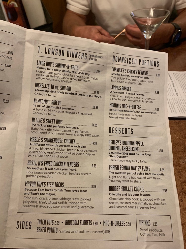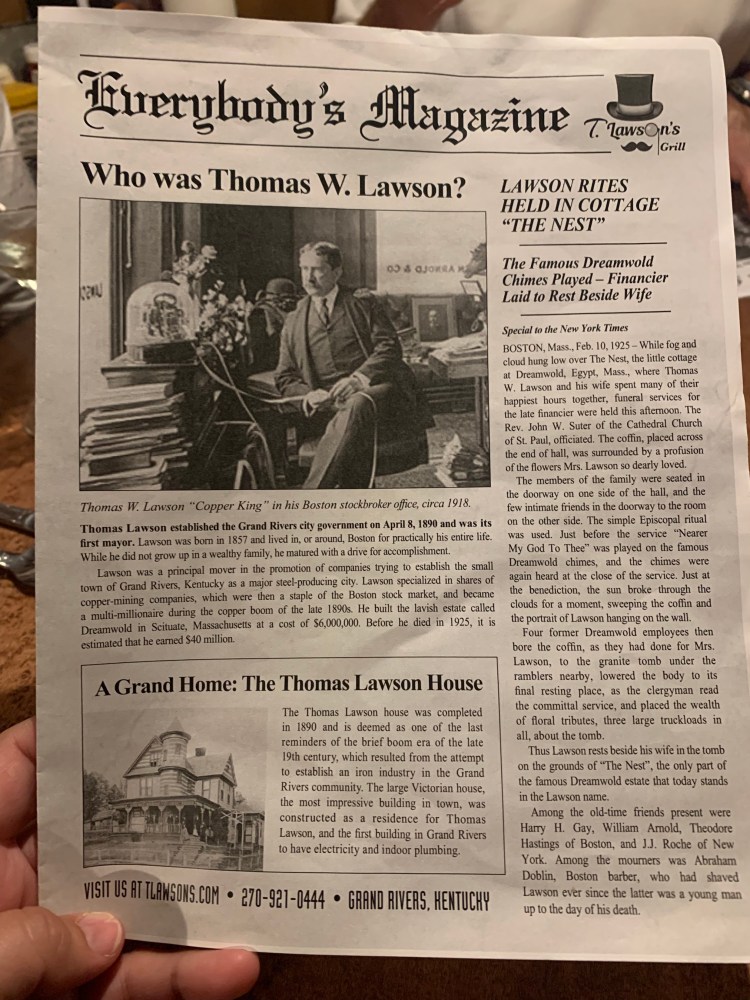 The place was named after Thomas Lawson who tried to establish the town of Grand Rapids as a steel powerhouse. This never happened however Kentucky once was the 3rd largest producer of coal. Lawson made his millions in copper back in Boston where he lived most of his life. The menu had a bit of information about him and in an earlier blog of mine I had found a granite Memorial to him in town. He was definitely the most famous person this town has produced.