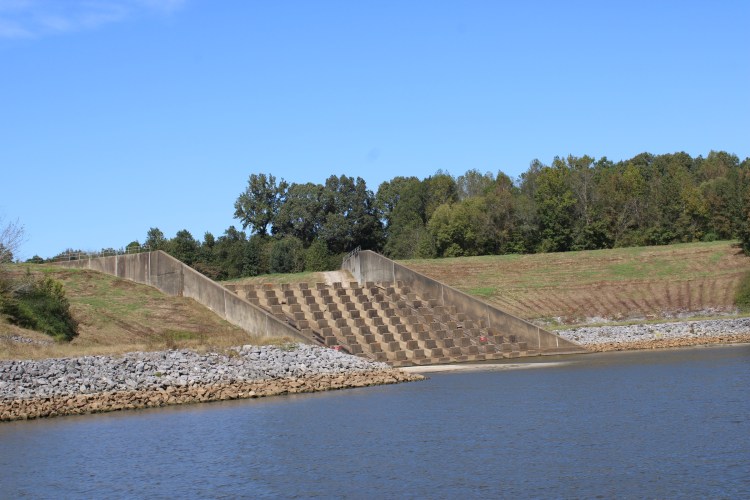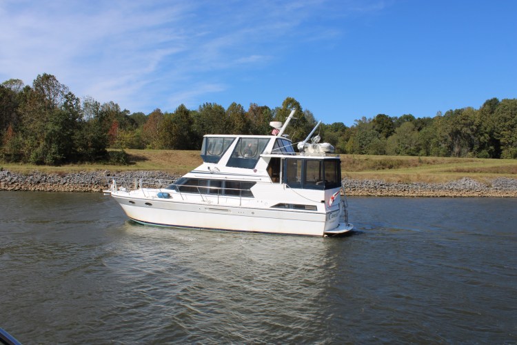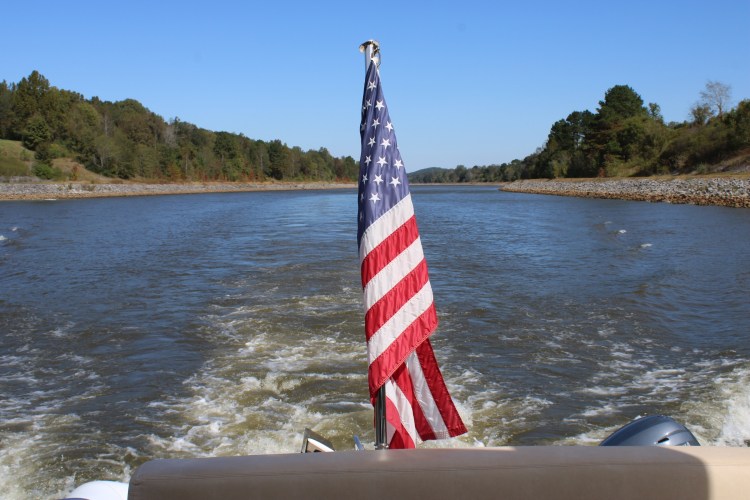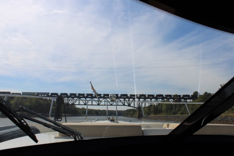 It is 235 miles of a man made waterway that links the Gulf of Mexico with the Tennessee River. It connects near Demopolis, Alabama with the Black Warrior – Tombigbee River. It took 12 years to build this by the Army Corp of Engineers and was finished in Dec 1984. Here is a train going over us as we navigate this river.