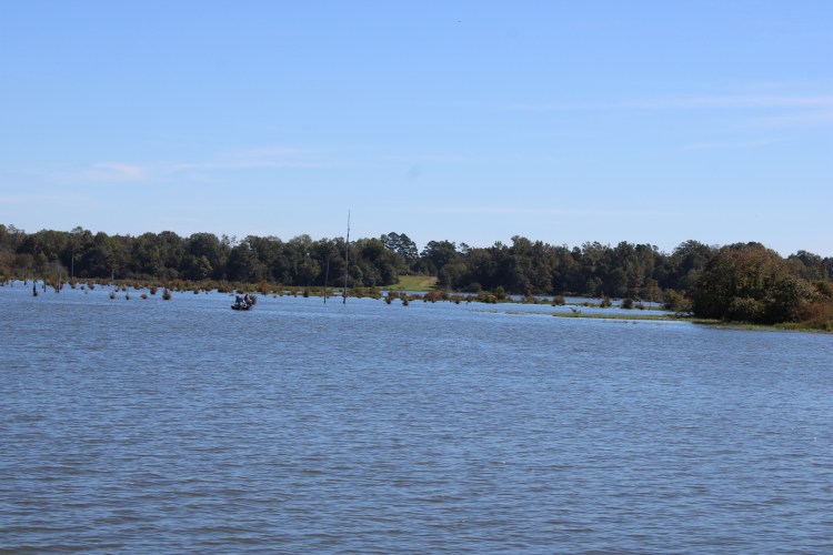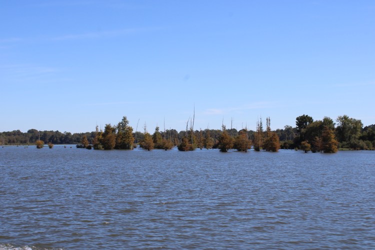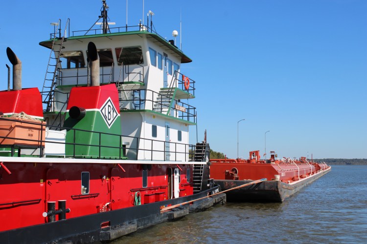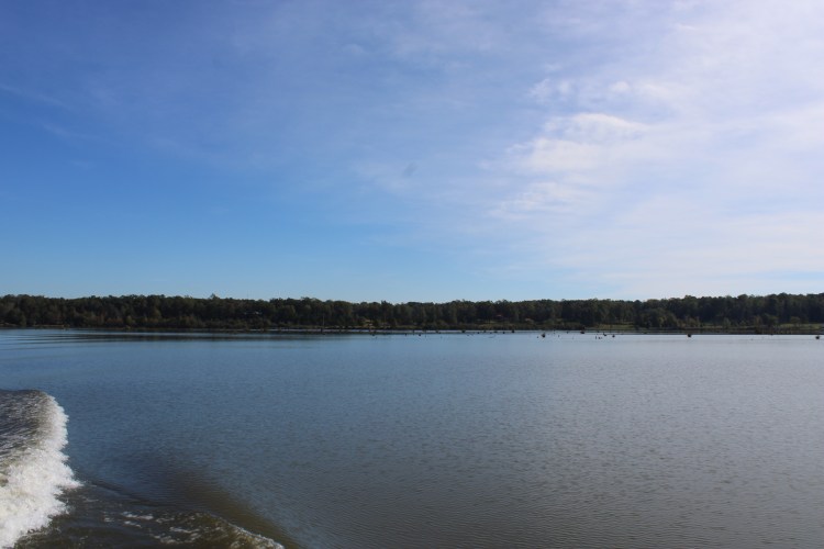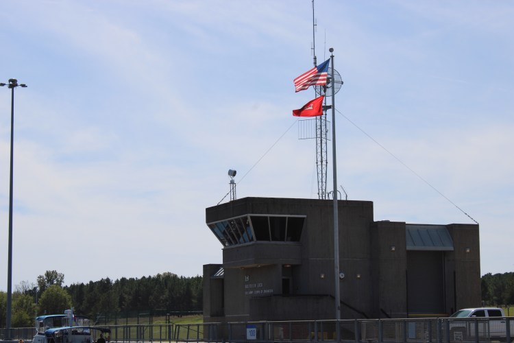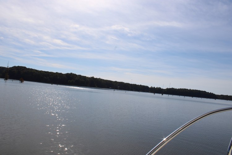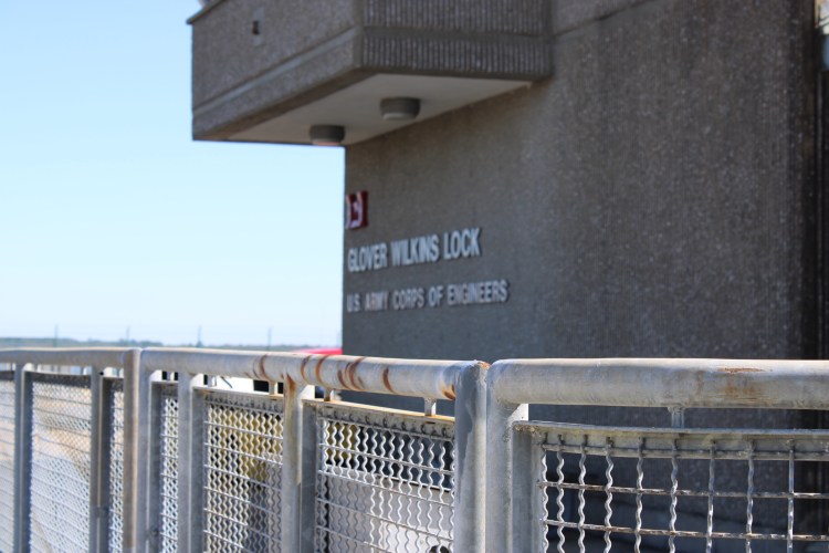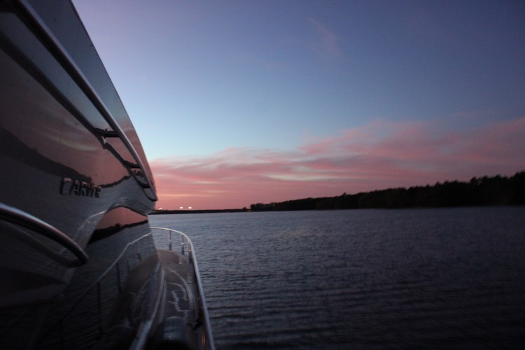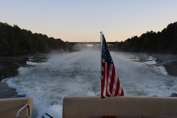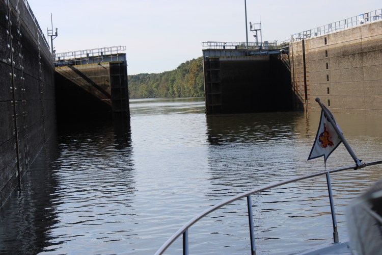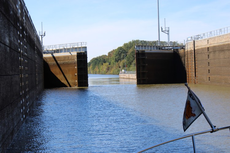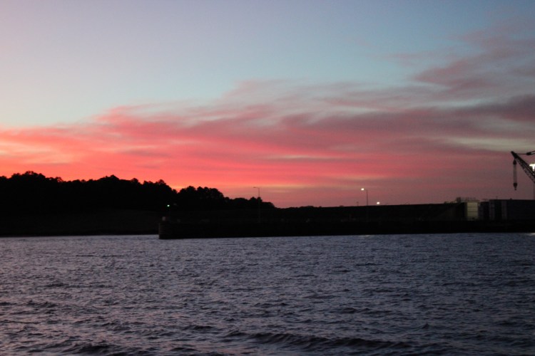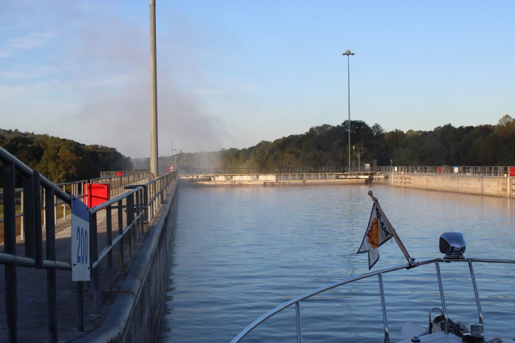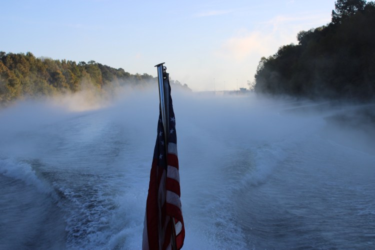 Well, the day started out early! We got up around 6 am and Nick called the lock which was less than 1 mile away. He said we could come right over so we finished our first cup of joe and got organized to shove off. Once we got to the lock everything was quick and smooth! The lockmaster was so nice and chatty with us. We told him what we were trying to accomplish today (7 locks and 77 miles) and he was so great – he said he’d help us out and call the lockmasters at the next couple locks! Wow! This is what the sunrise on New Site, Mississippi looked like.