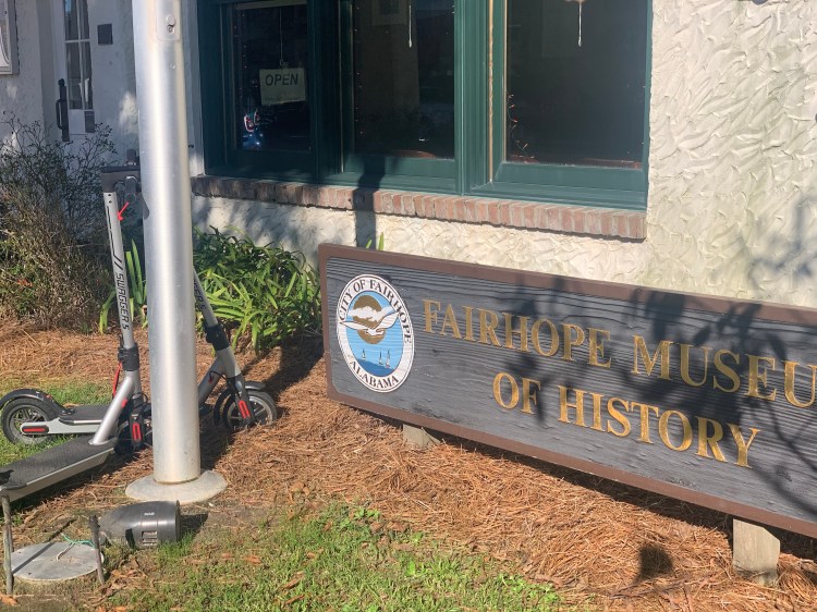 > olivemywhiskey posted: “10/23/19 Here we land in Fairhope! Nick gets the > scooters out right away! Nick stopped for this sign. I think he thought he > could cool her off. And this sculpture reminds us of a sailfish saluting > the sun! In the Alabama tourism book 100th year” >