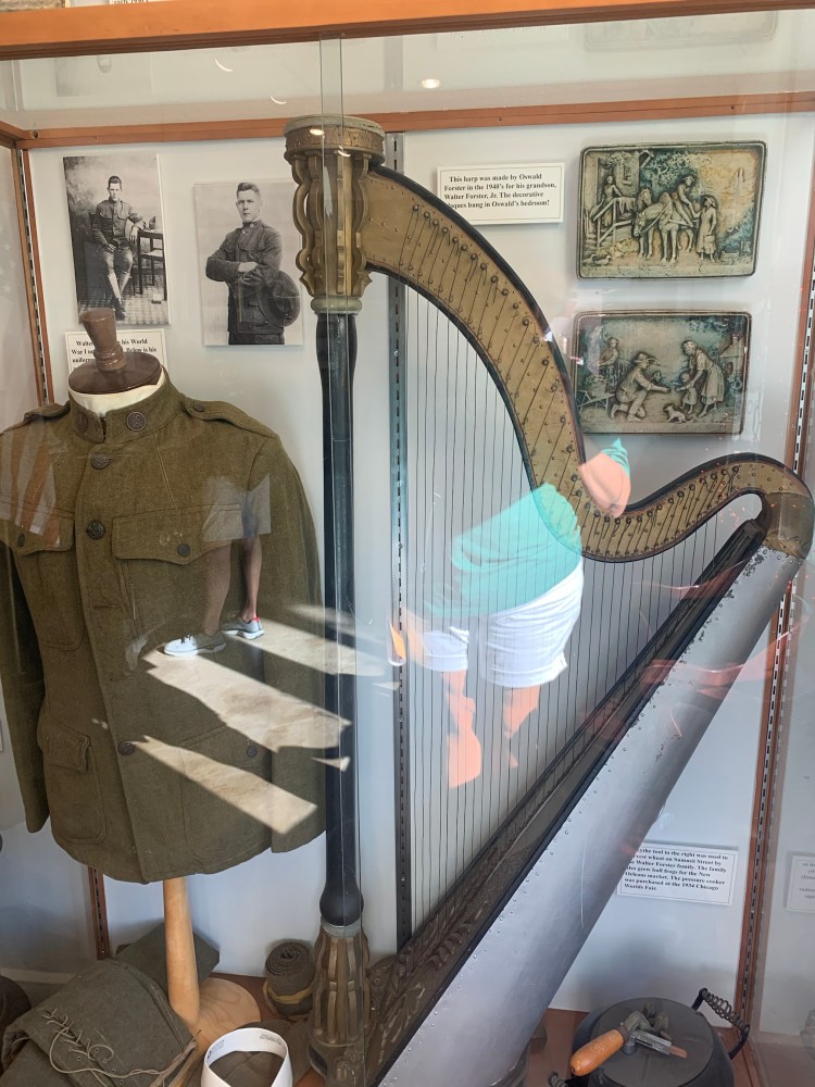 This was interesting – a local citizen made this harp for his son. The uniform on the left is a WW I uniform.