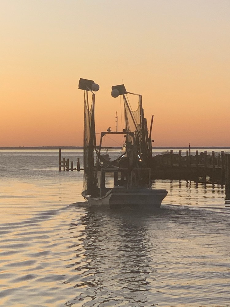 Sunset view from the boat. A shrimp boat was going out to the bay for some evening work?