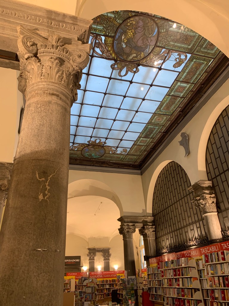 The beautiful stain glass ceiling inside the bookstore.