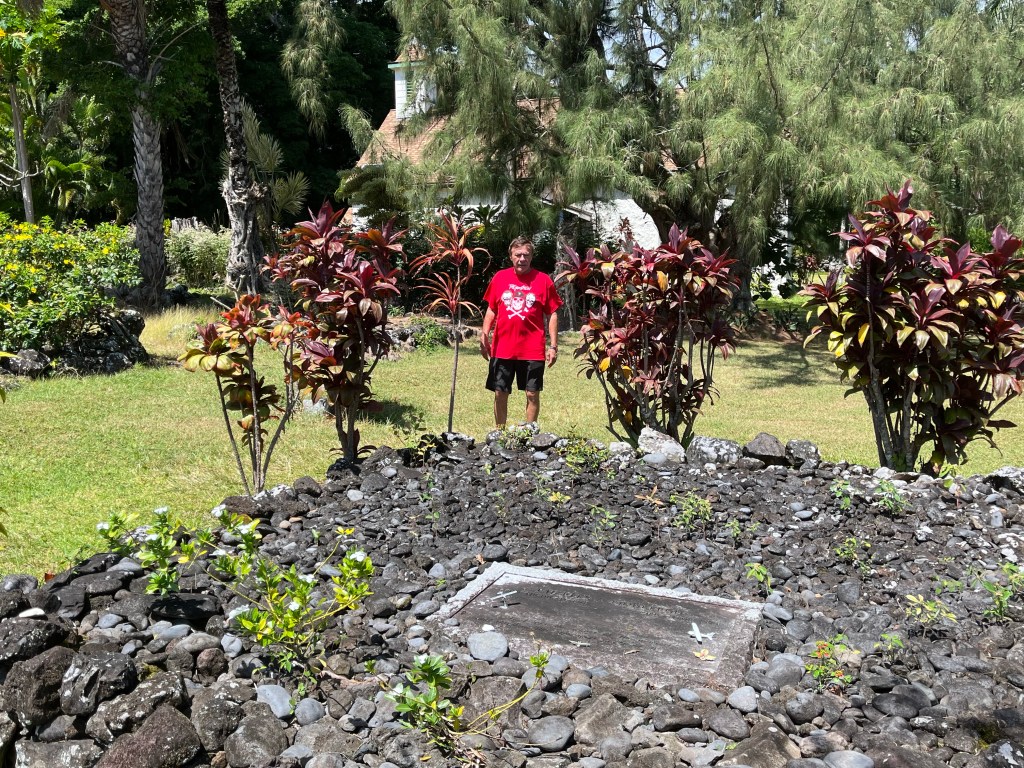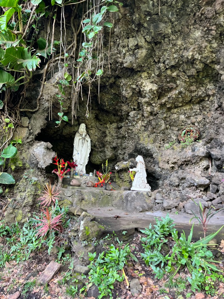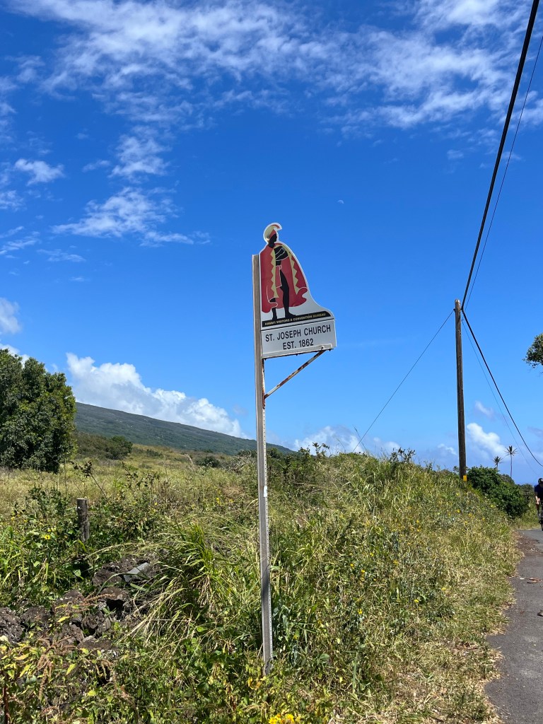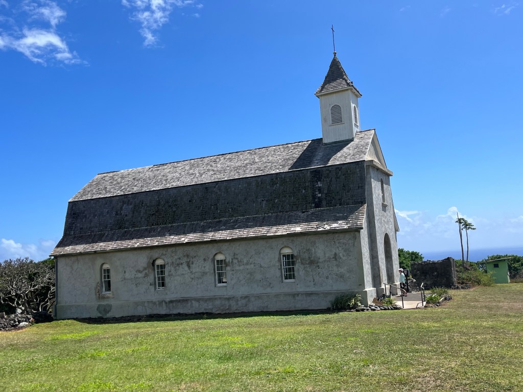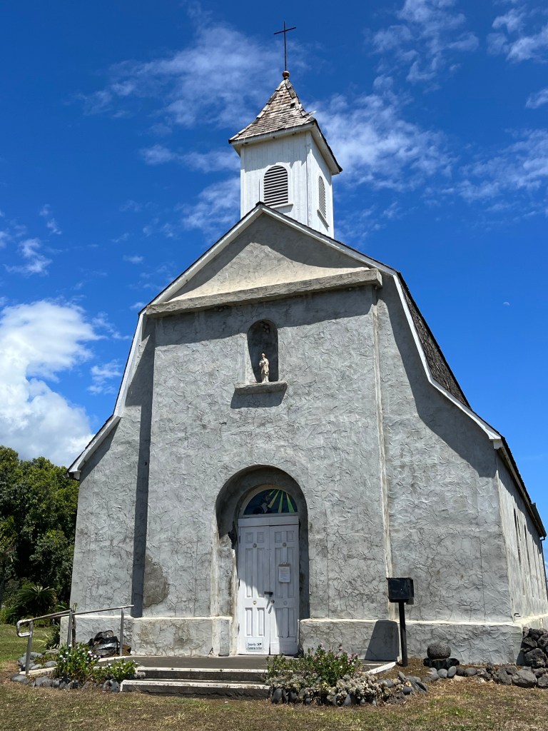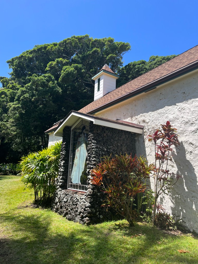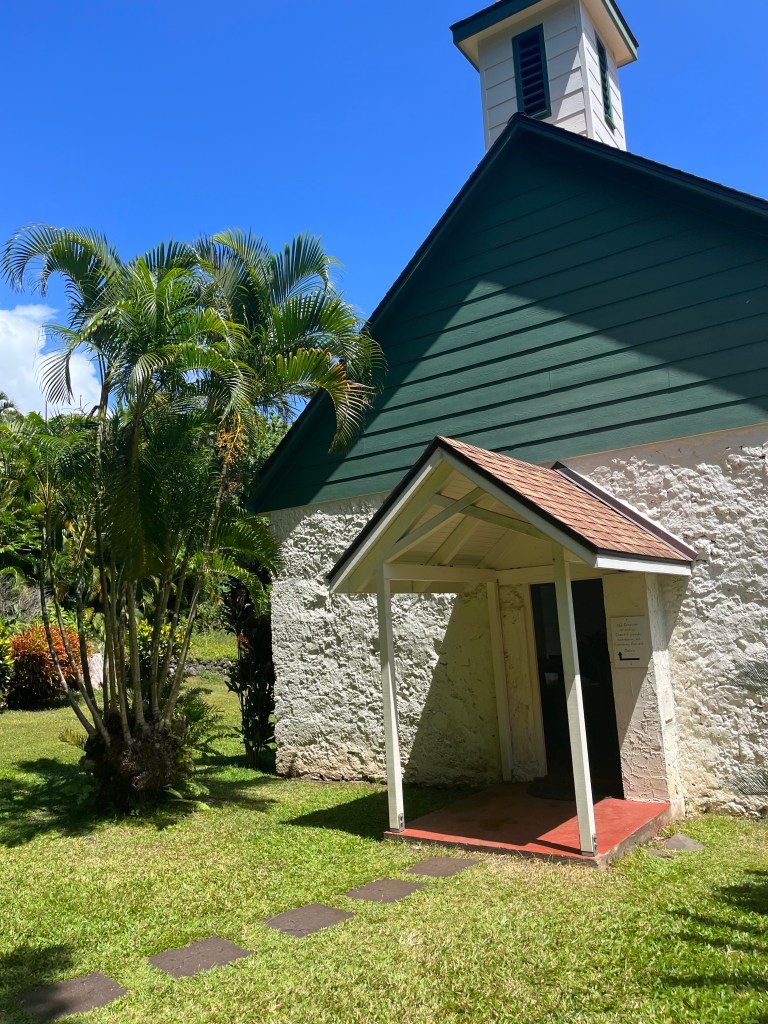 Just beyond the town of Hana is Charles Lindberghs grave near a quaint church. The church still holds services today and also has a guard at the front door. The guard is an orange tabby.