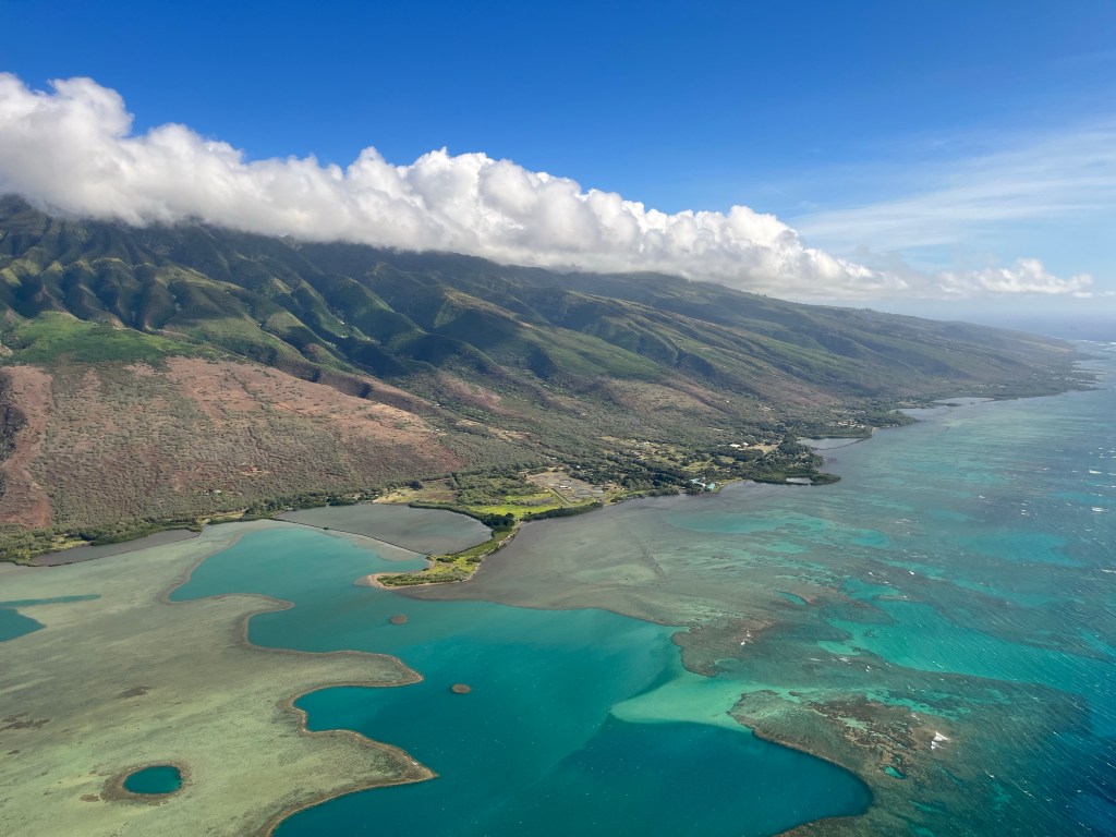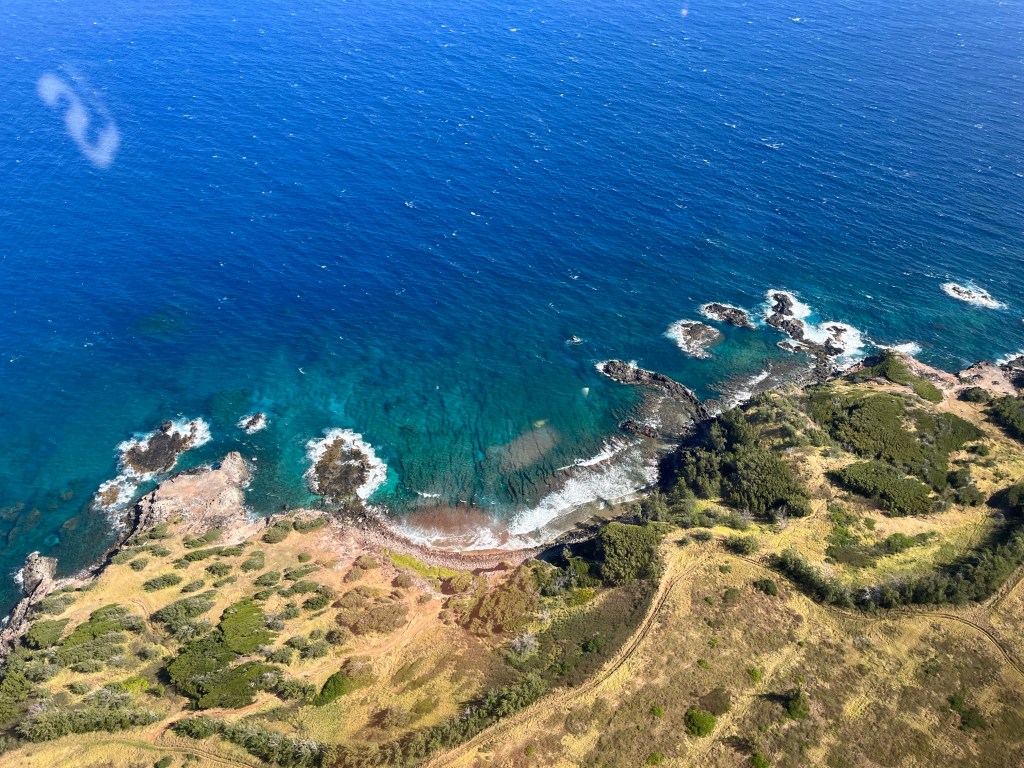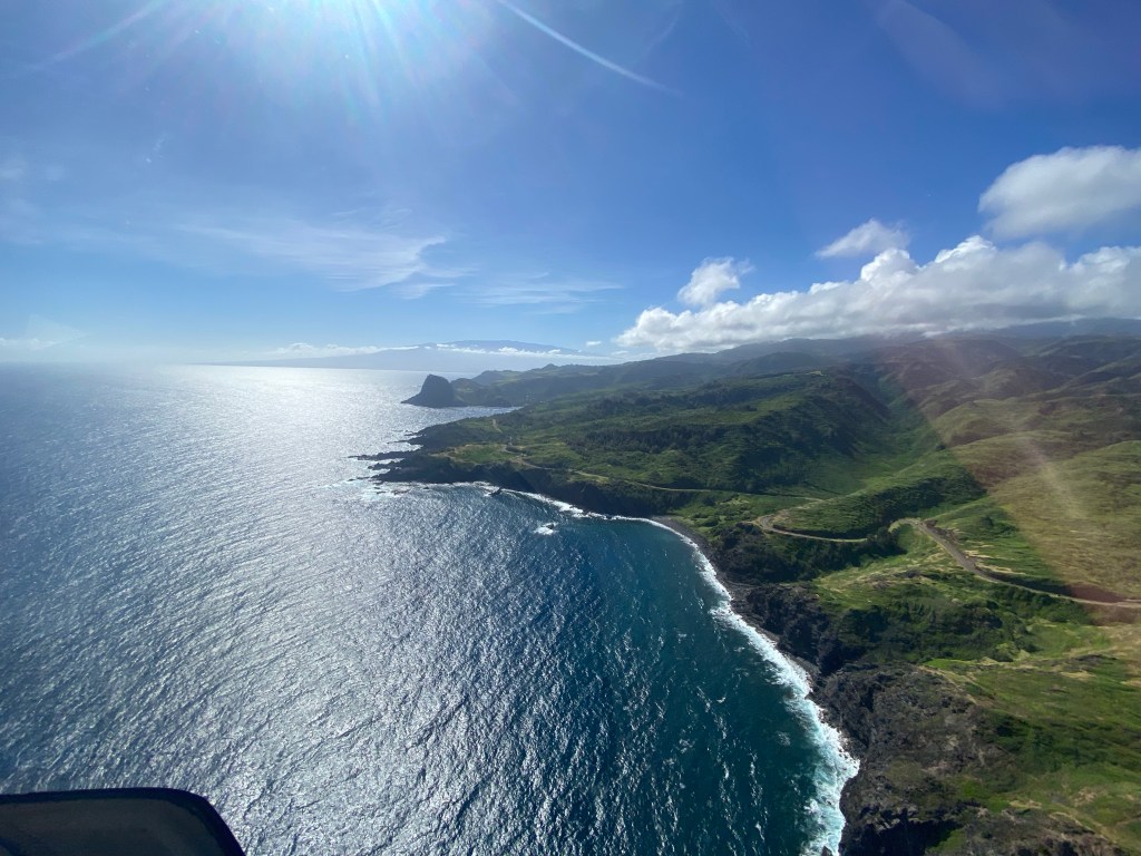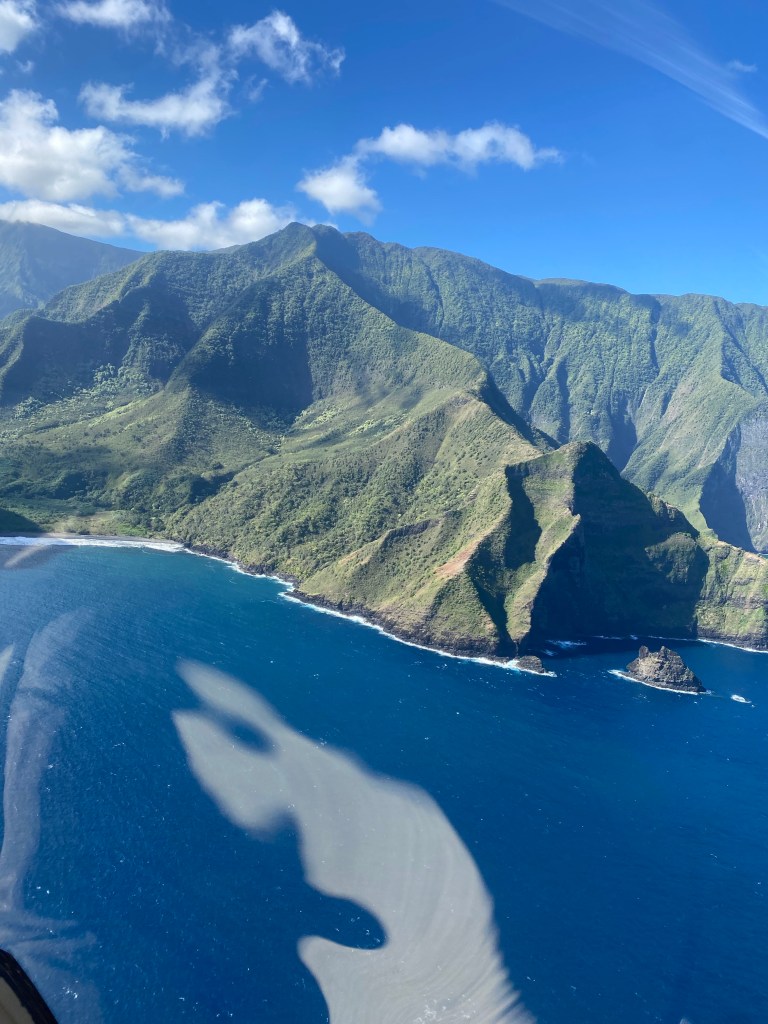 We started to fly to Moloka’i after the whale watching. Moloka’i used to be a Leprosy Colony starting in 1865. In 1905 it was recorded that over 5,800 people were there. Including Father Damien from Belgium. He arrived in 1873 and found about 800 people living in squalor. He began building them homes and creating a colony for them. But after only 3 years he contracted it too. He lived on the island for almost 17 years and died there.