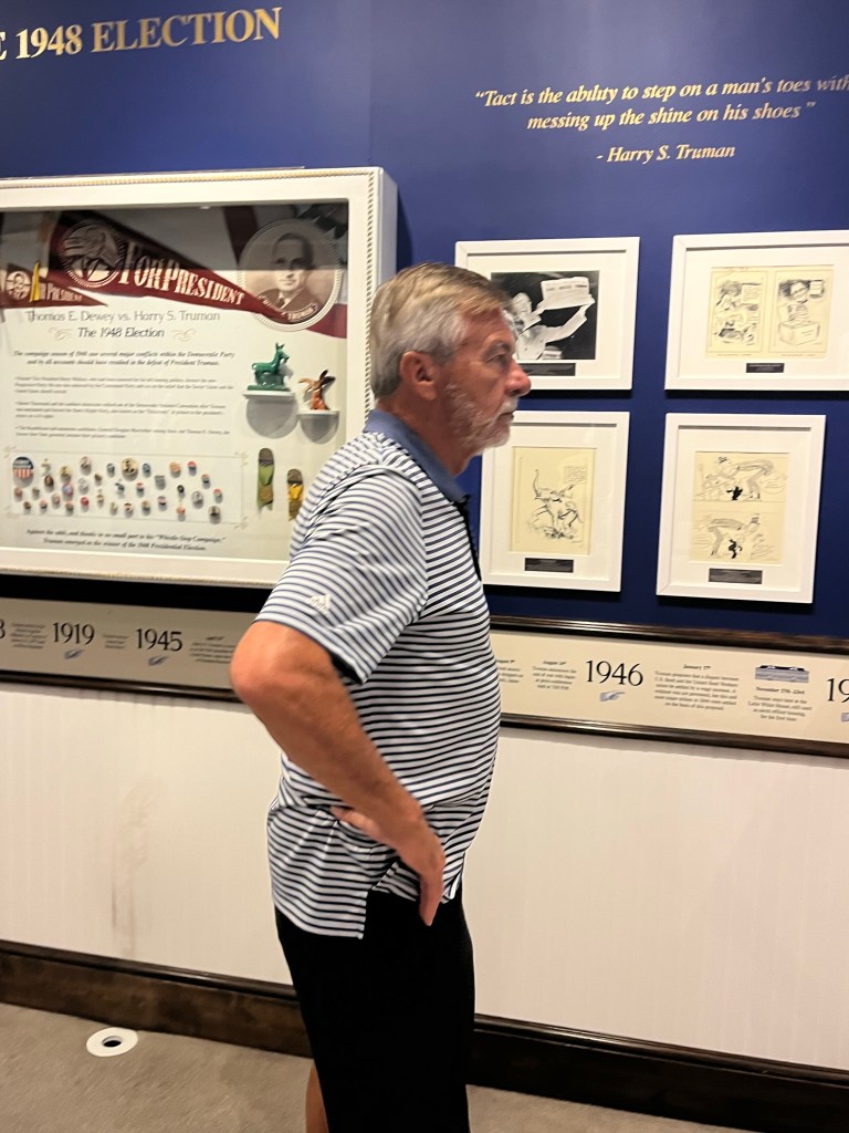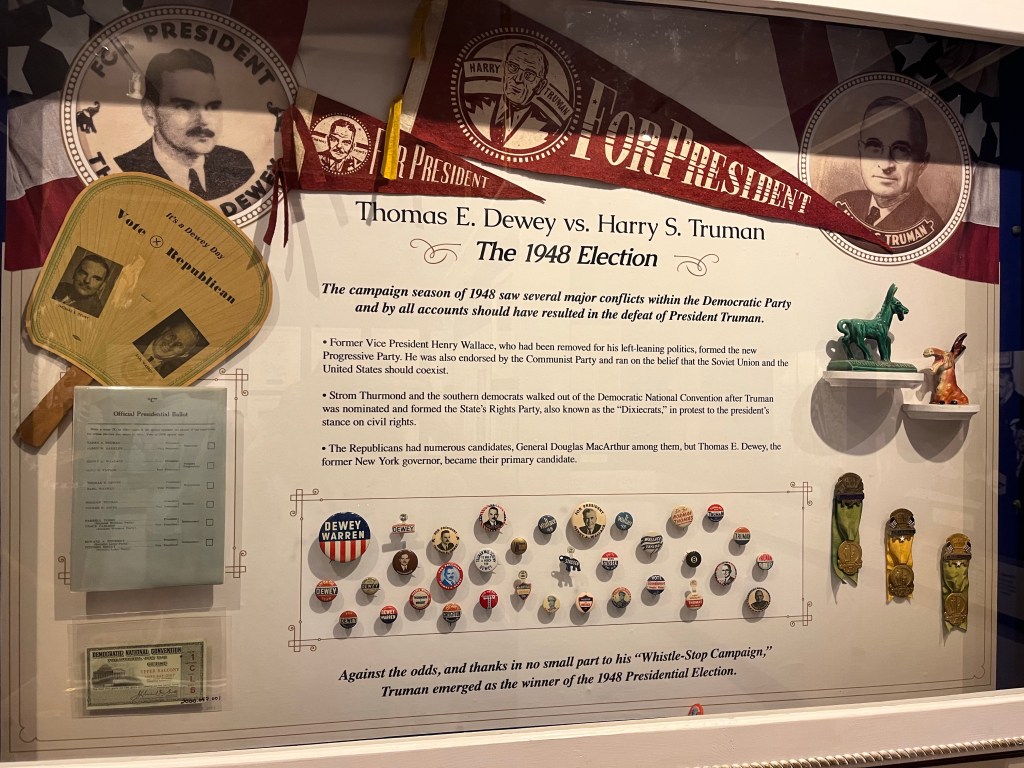 This display was interesting. Basically said that Truman shouldn’t have won the 1948 election. FDRs former VP (before Truman) entered the race by forming a new party. He walked out of the Democrat Party and made his new party and called it the Progressive Party and was endorsed by the Communist Party! Also Strom Thurman was in the 1948 Presidential race but broke off from the Democrat Party in protest of their creation of the Civil Right Department and he called himself a Dixiecrat. So the DNC was a mess and it was a shocker that with all that division Truman still won!