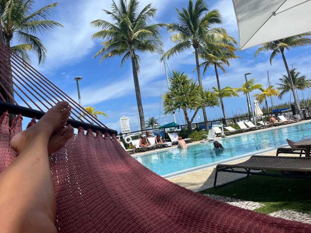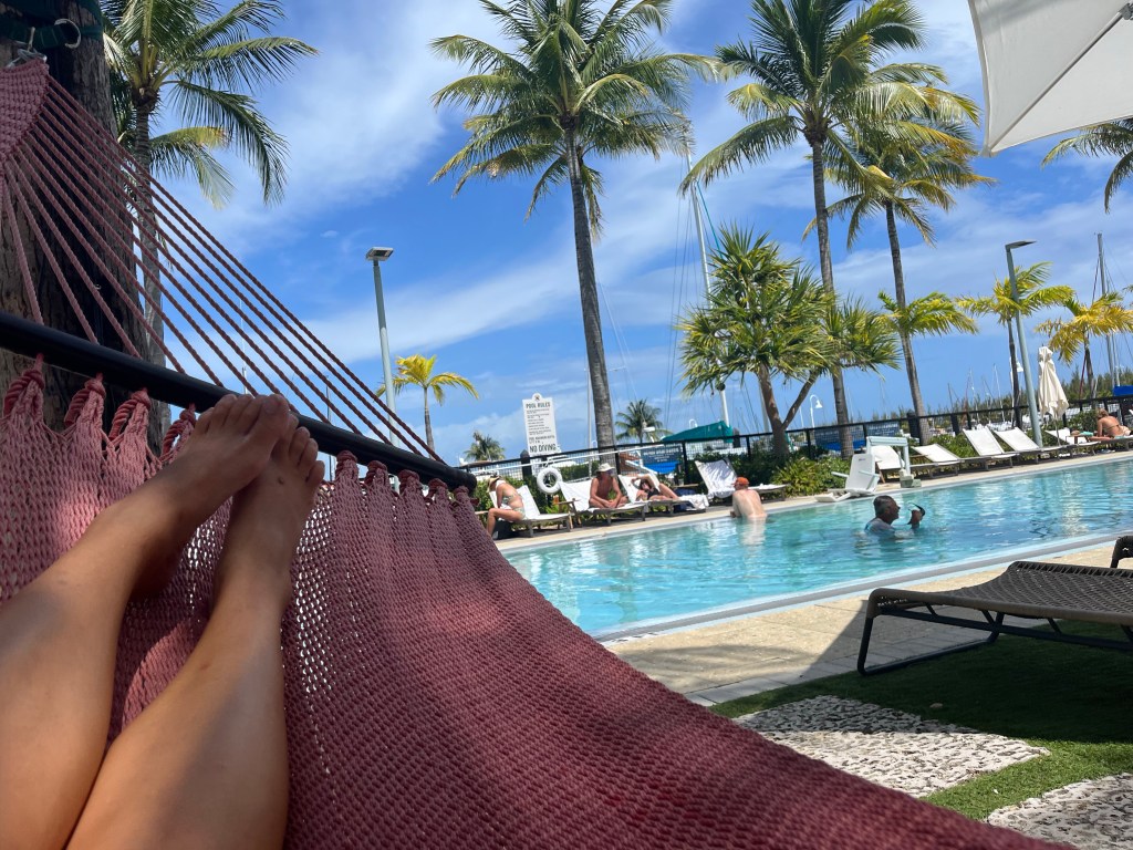 The rain stopped so we were back at the pool. Nick jumped right in and I used the hammock.