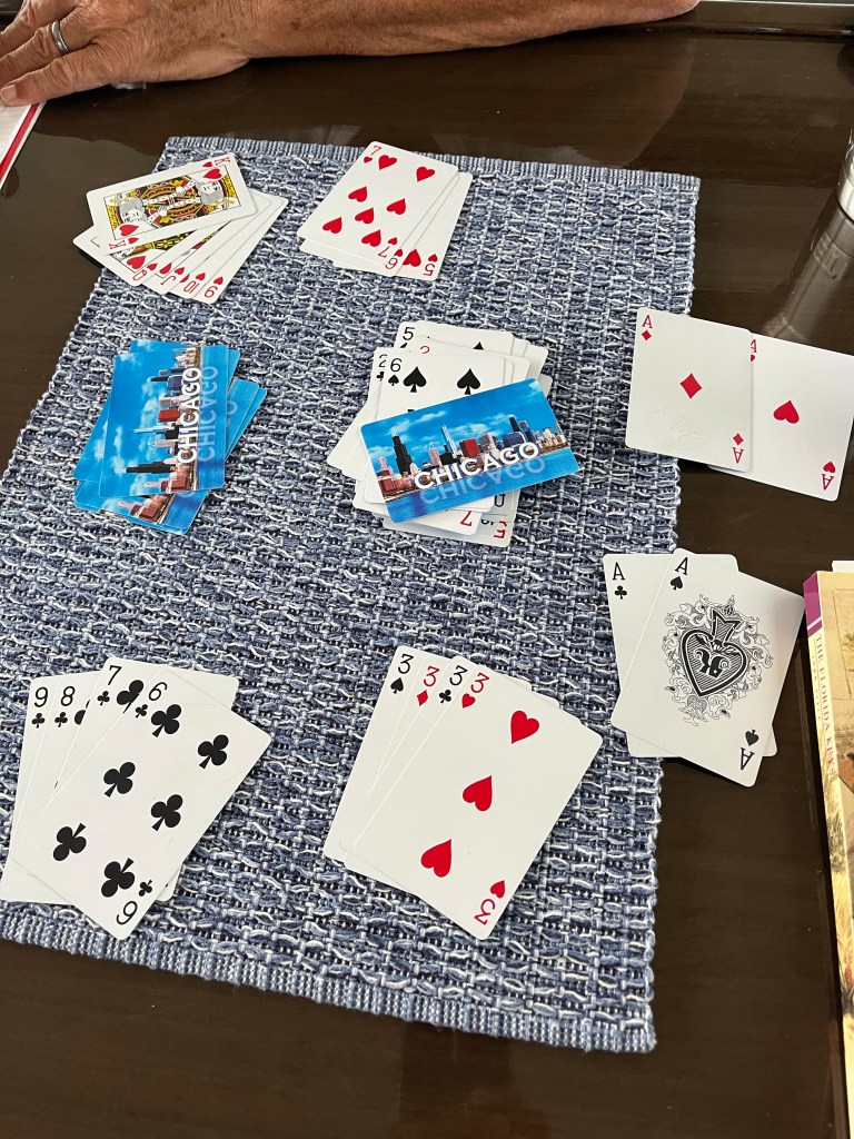 We needed to assist the mechanics back at the boat so to pass the time we played Gin. We are pretty competitive. Look at this call – we both were sitting on 2 aces.
