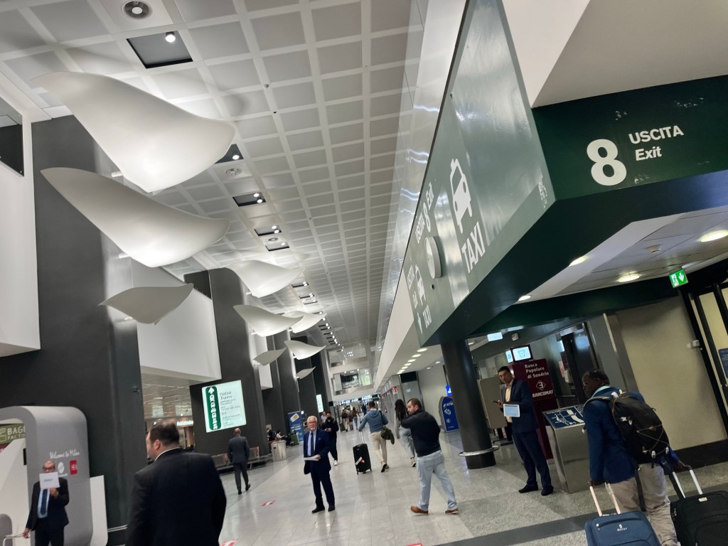 We arrive in Milano Airport. All Italian Airport apparently were designed by the same guy. This Milano Airport is crazy!