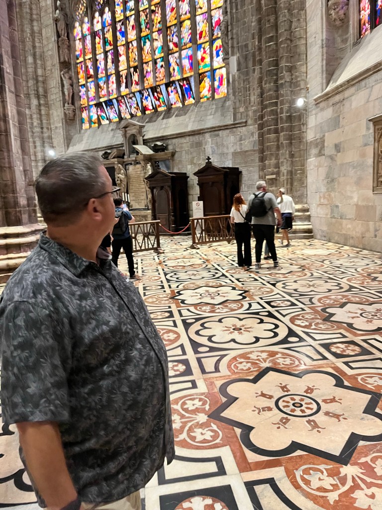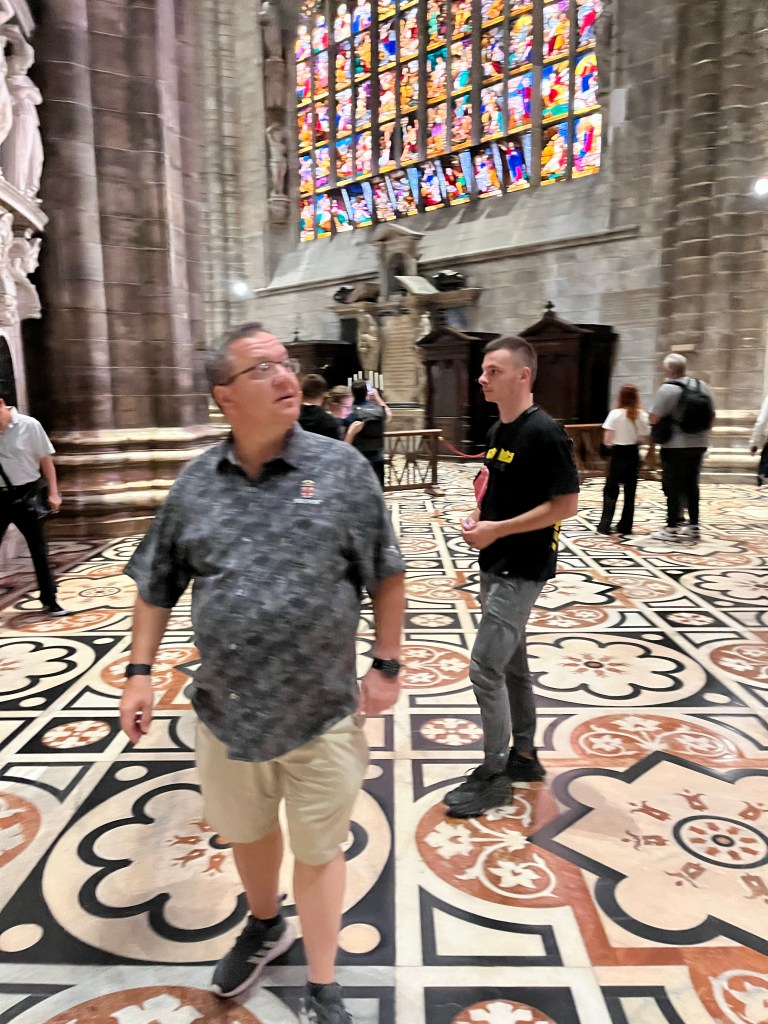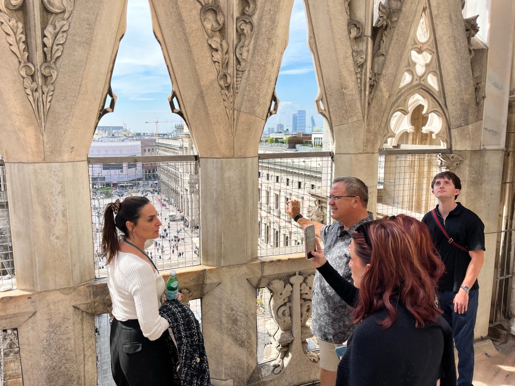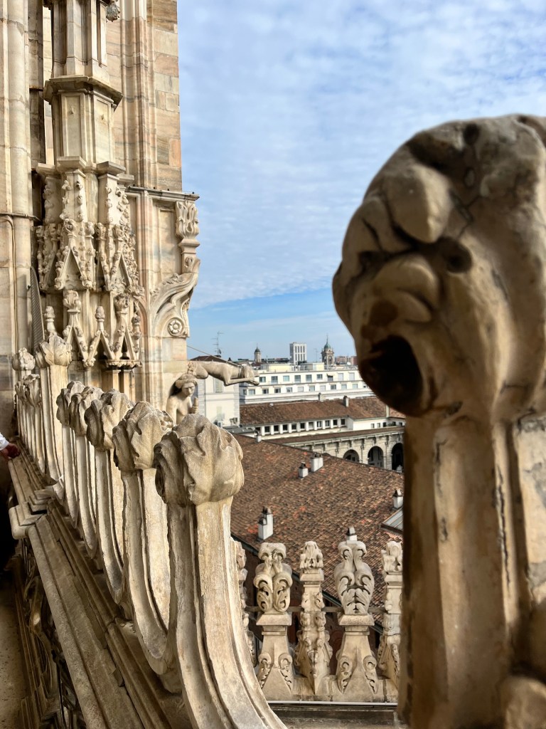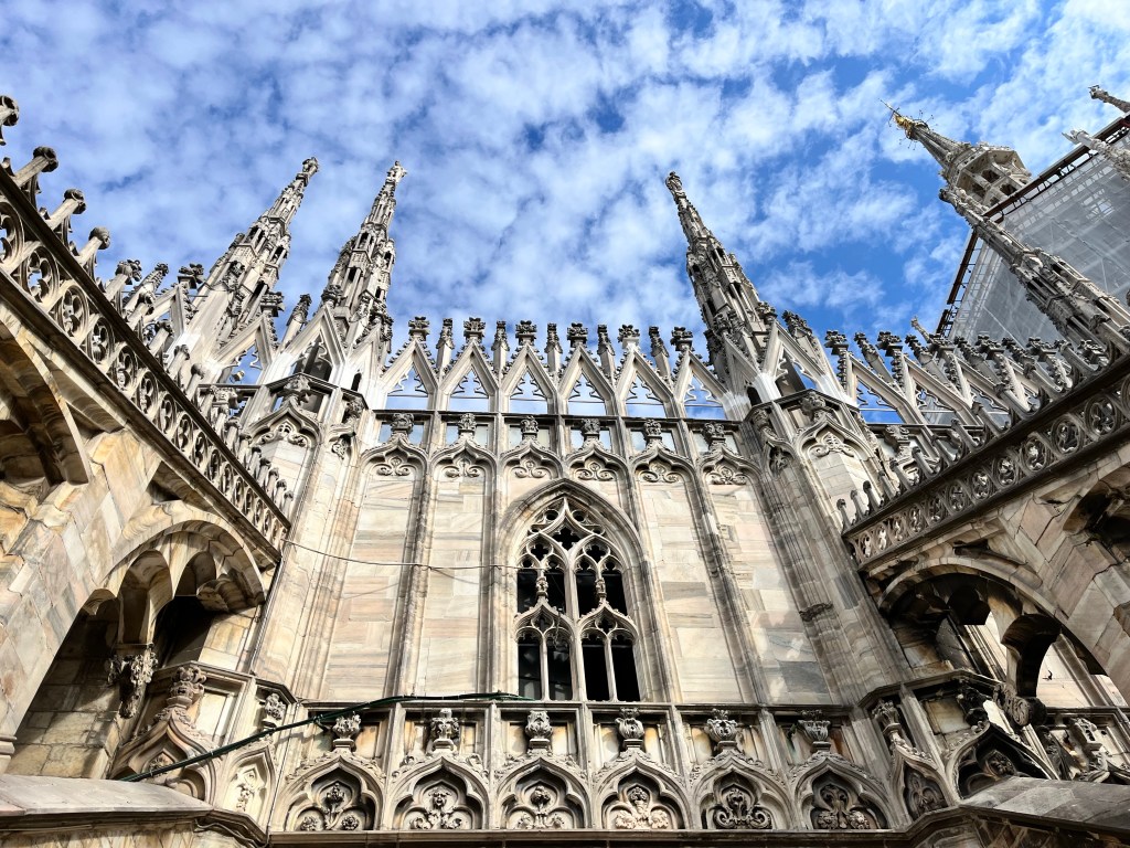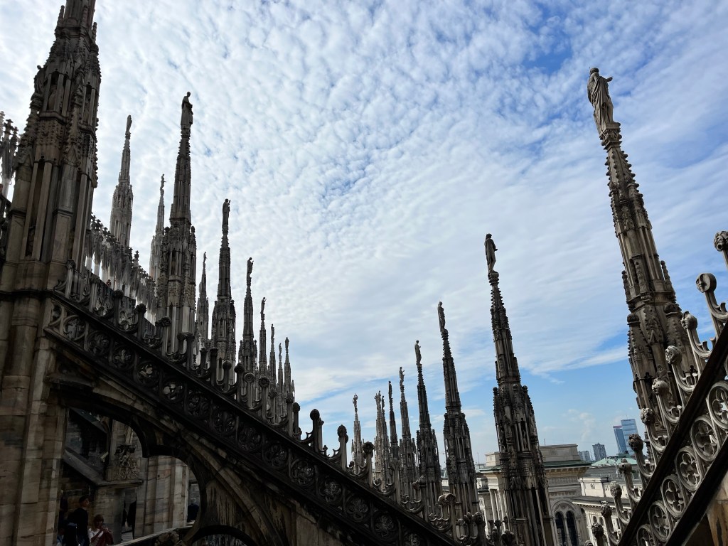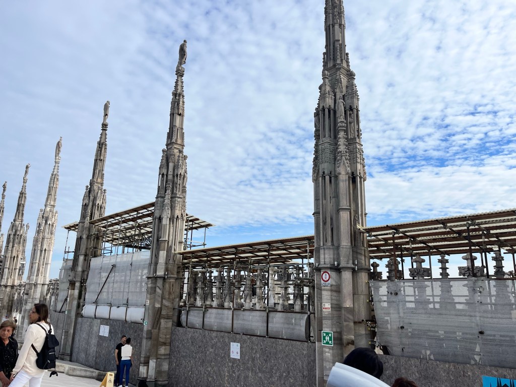 The views were totally worth the prices in the cafe! Then it was time for the tour of the Cathedral. The tour started climbing to the rooftop!!! I was so surprised how many people were on the roof. If you go to Milan I recommend the rooftop of the Cathedral as a MUST SEE! Not only for the views but also an up close and personal look at the buildings architecture. The mini stayed and elaborate decorations are worth the climbing! The cathedral was commissioned in 1385 to replace the one that existed on that sight. Construction started in 1386 and has not stopped since. Because of the white marble chosen for the exterior – it must be repaired and replaced all the time.