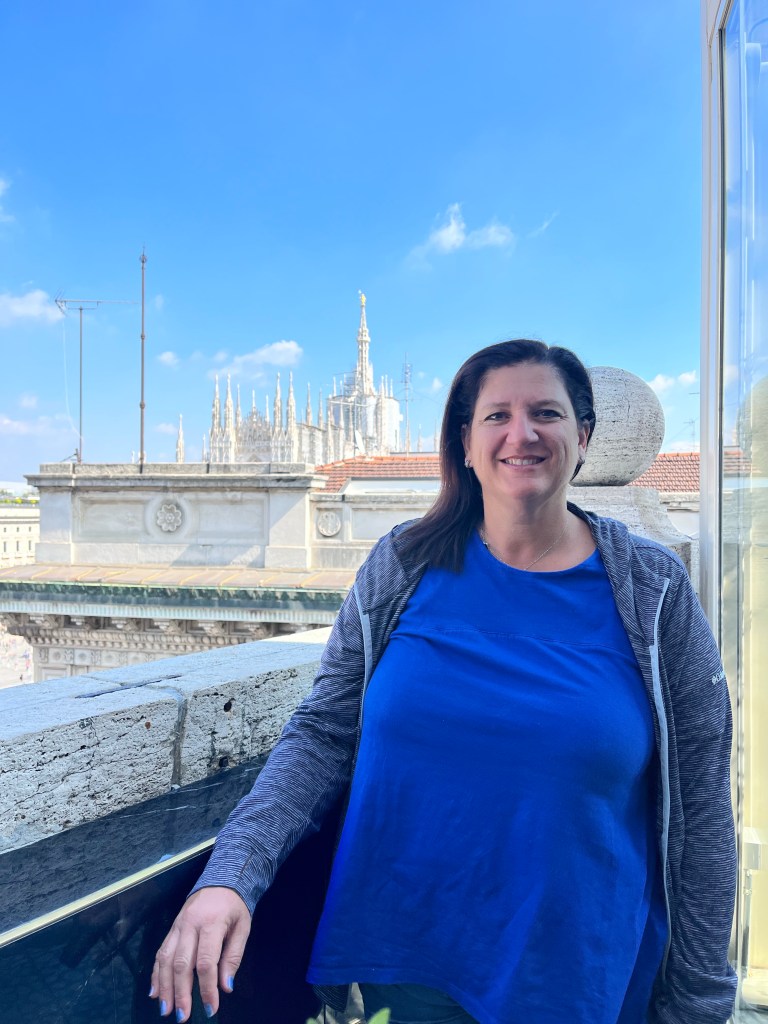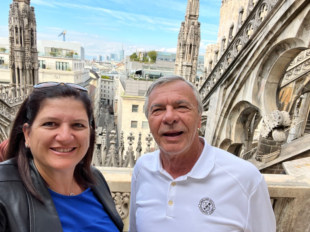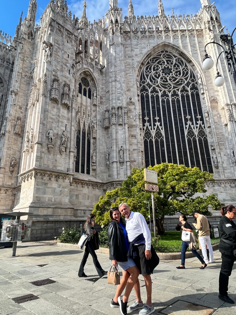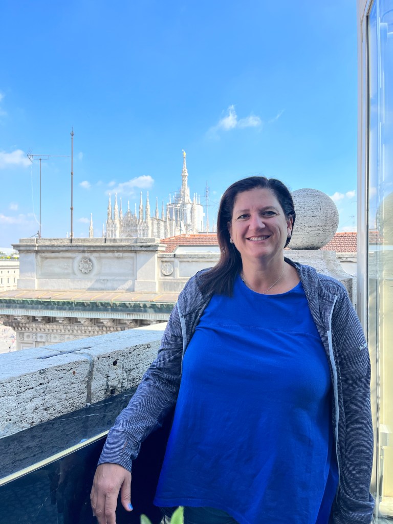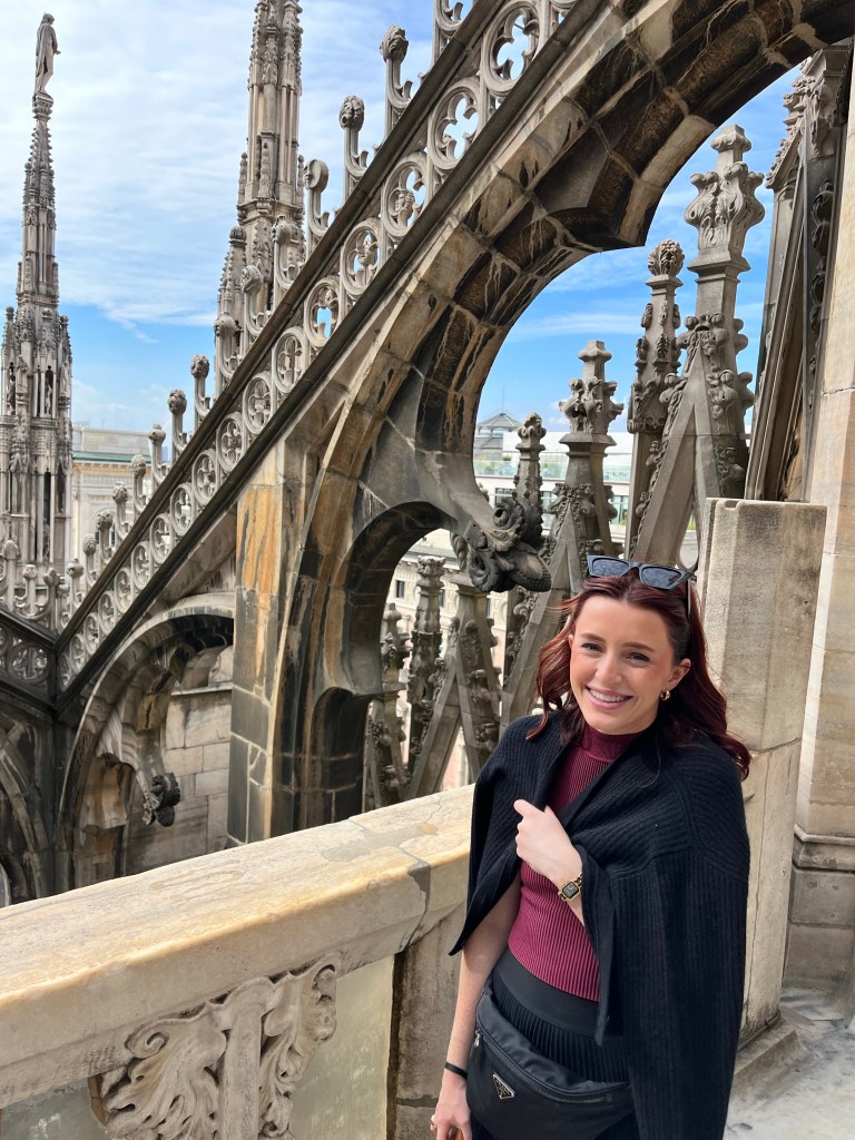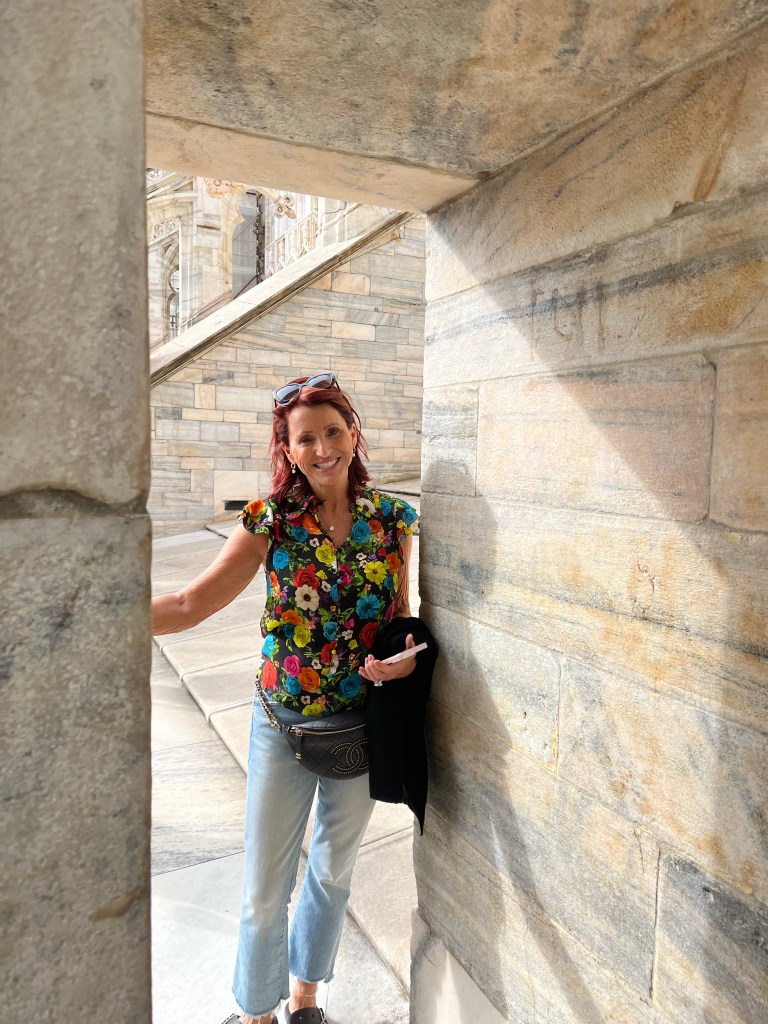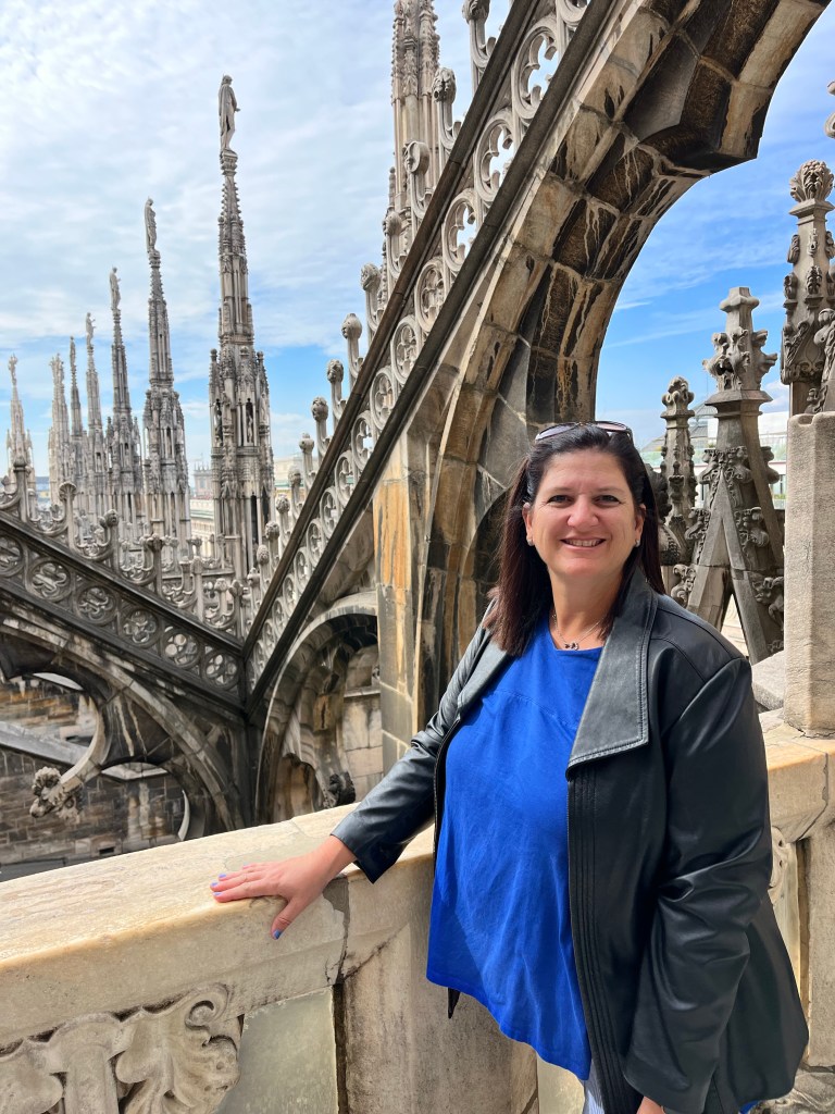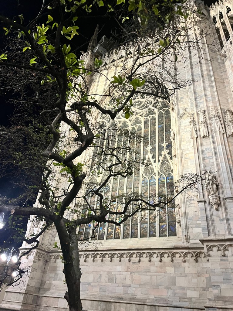 The views were totally worth the prices in the cafe! Then it was time for the tour of the Cathedral. The tour started climbing to the rooftop!!! I was so surprised how many people were on the roof. If you go to Milan I recommend the rooftop of the Cathedral as a MUST SEE! Not only for the views but also an up close and personal look at the buildings architecture. The mini stayed and elaborate decorations are worth the climbing! The cathedral was commissioned in 1385 to replace the one that existed on that sight. Construction started in 1386 and has not stopped since. Because of the white marble chosen for the exterior – it must be repaired and replaced all the time.