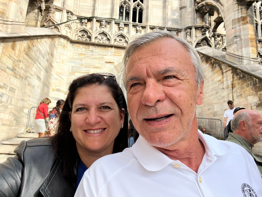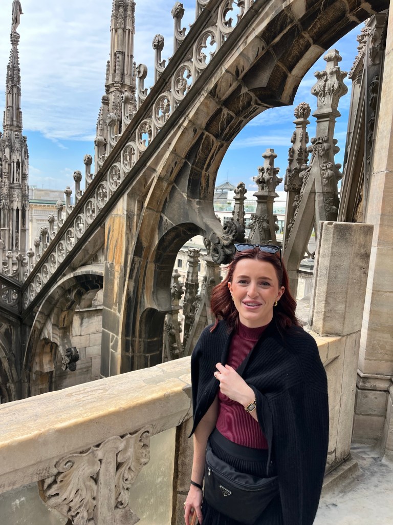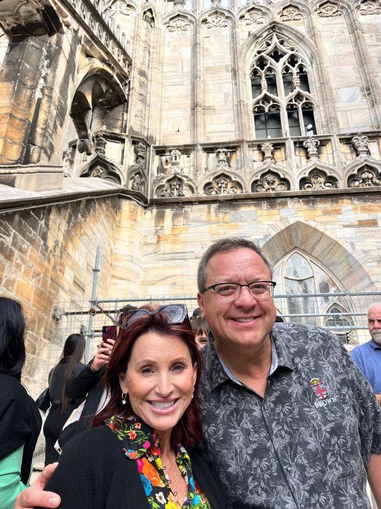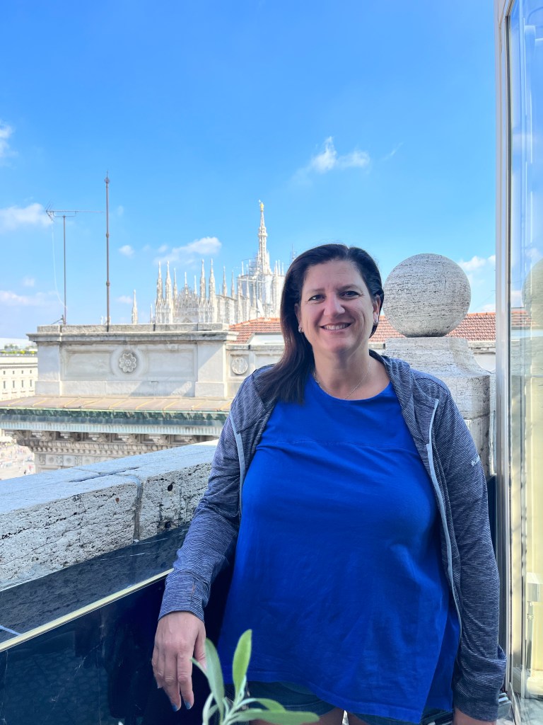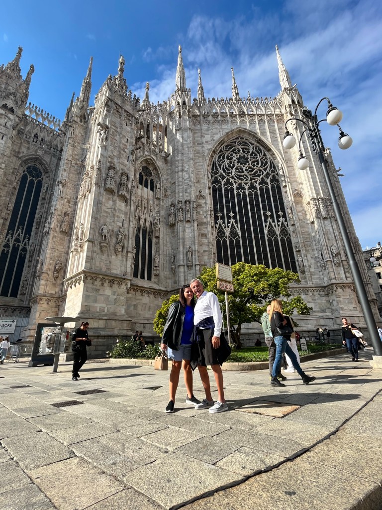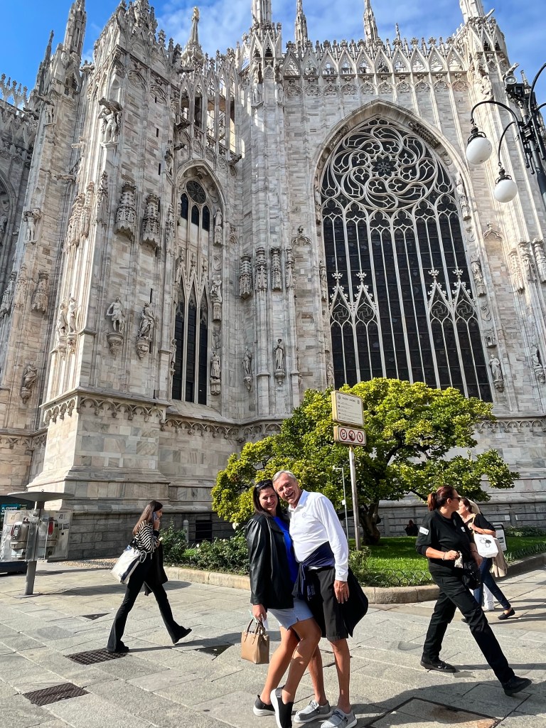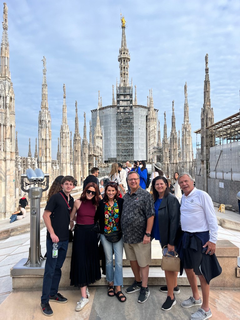 The views were totally worth the prices in the cafe! Then it was time for the tour of the Cathedral. The tour started climbing to the rooftop!!! I was so surprised how many people were on the roof. If you go to Milan I recommend the rooftop of the Cathedral as a MUST SEE! Not only for the views but also an up close and personal look at the buildings architecture. The mini stayed and elaborate decorations are worth the climbing! The cathedral was commissioned in 1385 to replace the one that existed on that sight. Construction started in 1386 and has not stopped since. Because of the white marble chosen for the exterior – it must be repaired and replaced all the time.