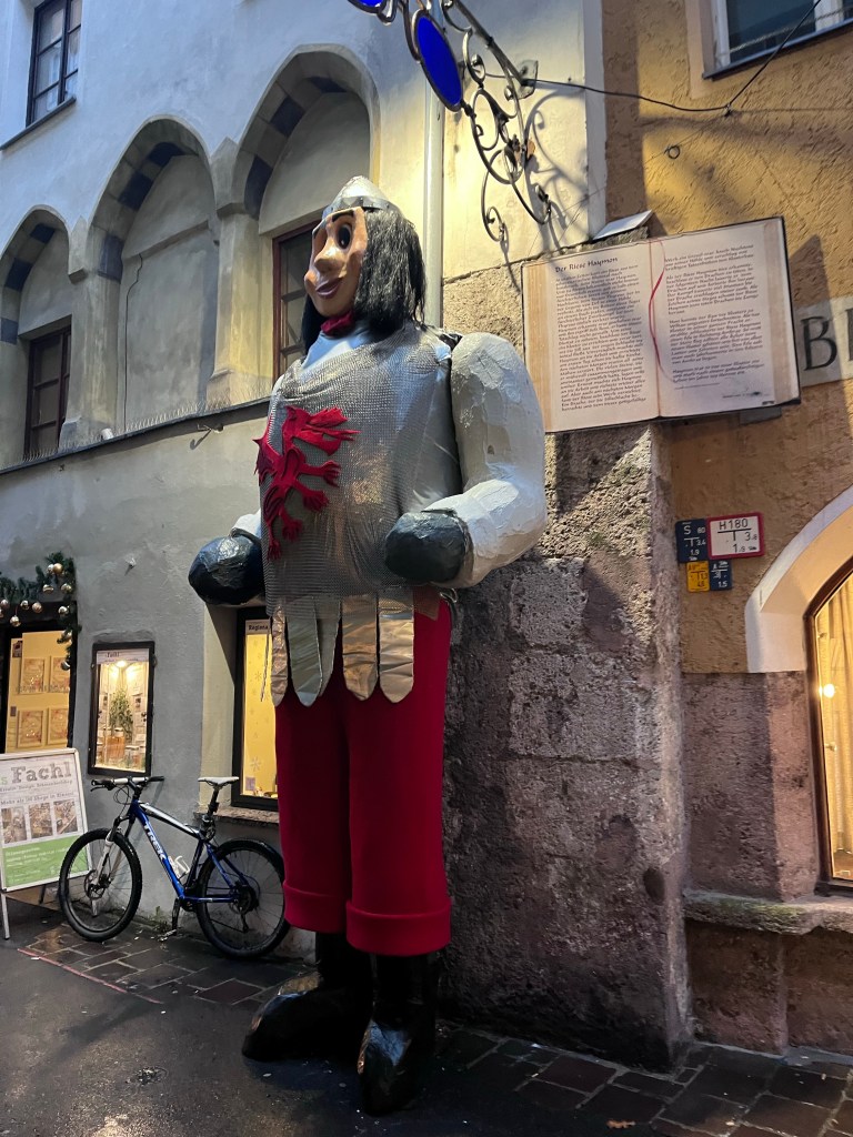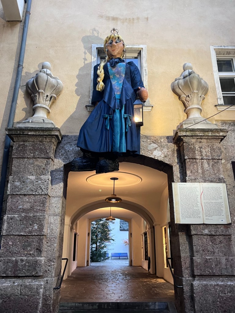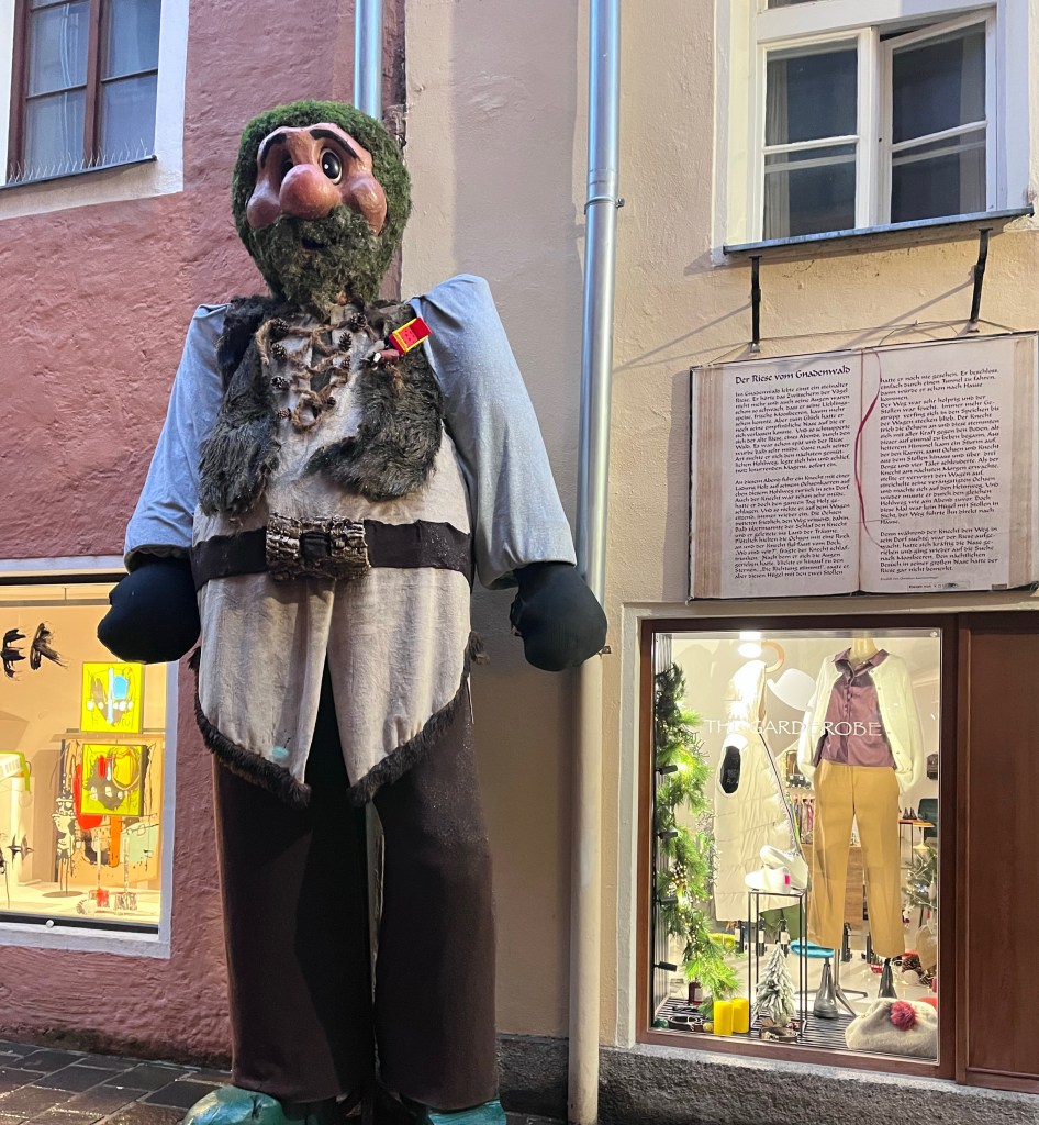The Christmas markets had amazing decorations set up. These giant people were everywhere you looked. Many were standing on the ground but some were hanging like these. They all were characters from children’s stories. I think this is Rapunzel.