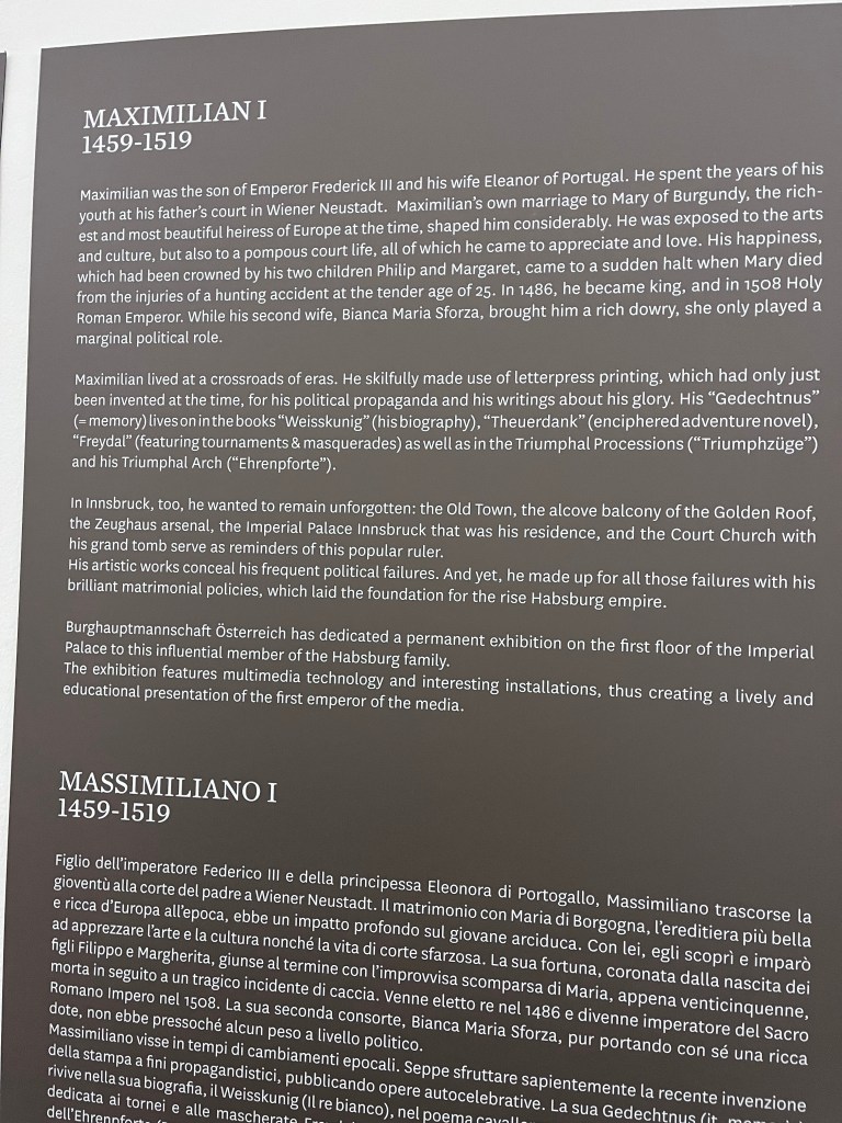 We started the day with a drizzle of rain and a rather cold stiffness in the air. Seemed like the perfect day for a museum. We learned all about Maximilian I. He became King in 1486 and in 1508 Holy Roman Emperor. He lived when the letterpress printing was invented.