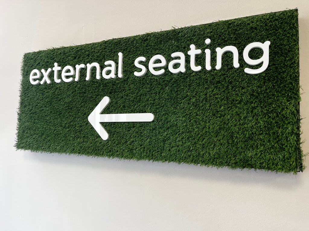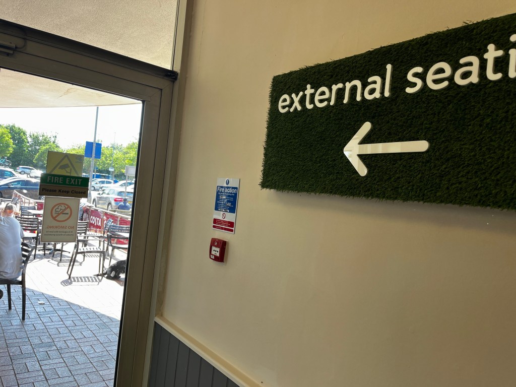 If you look closely you’ll see the « do not enter » red circle with a line through – on the glass door. It says to fire exit keep door closed. Oxymoron?