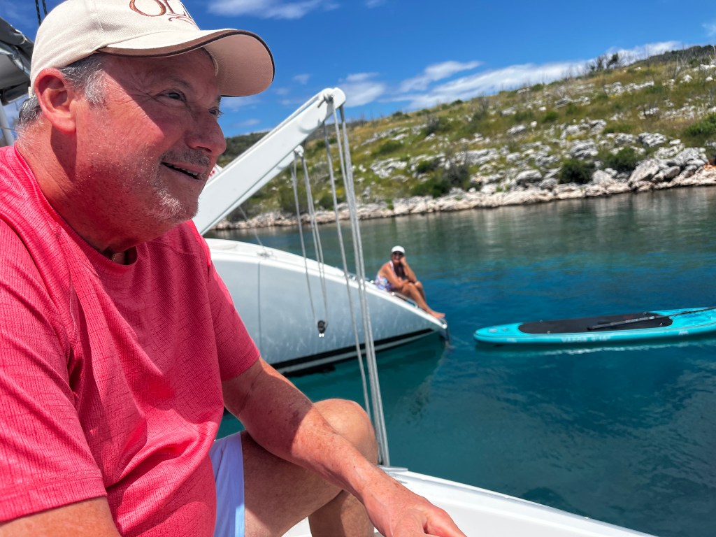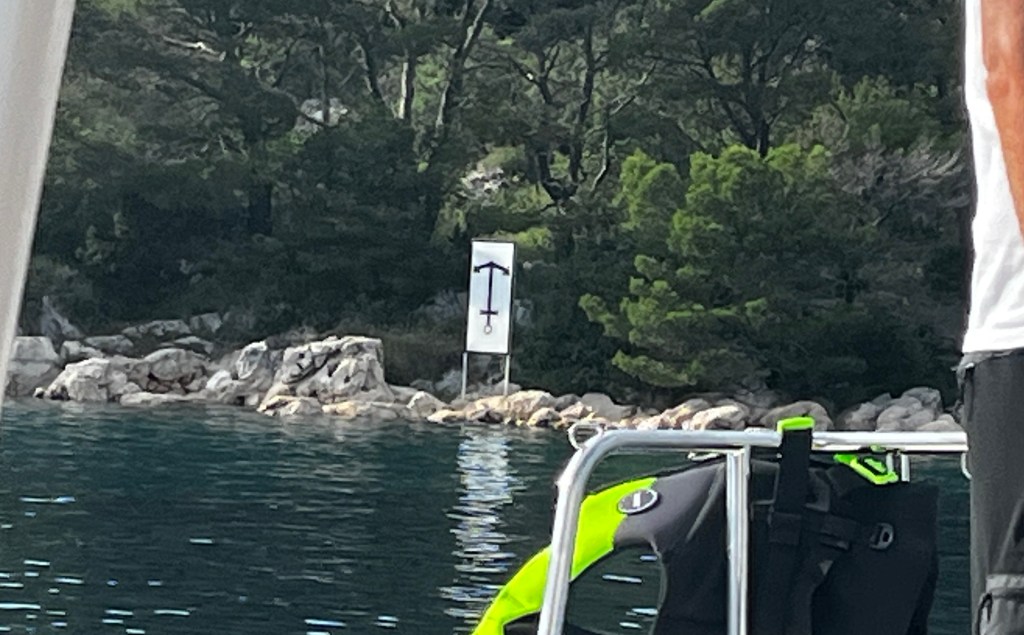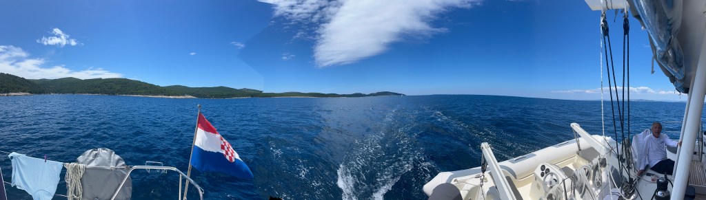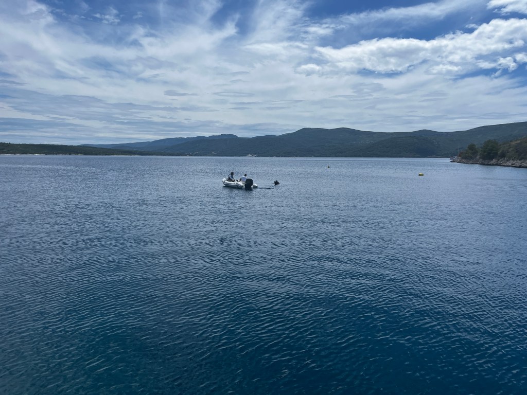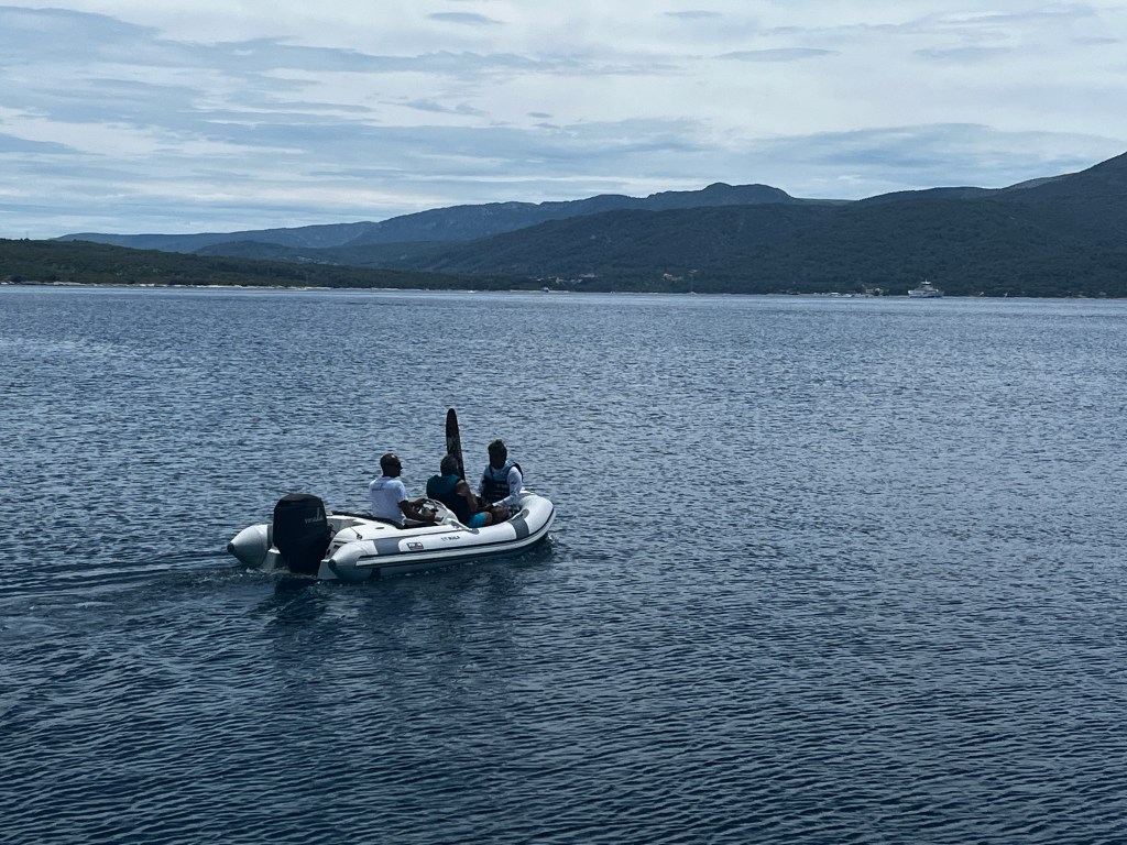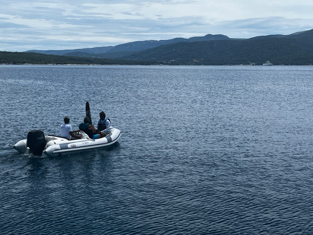 This morning we left Vis for a nice quiet spot where the boys want to try their hand at waterskiing behind Zoki’s tender. The bourse power was only 50 which isn’t a lot but they decided to try.